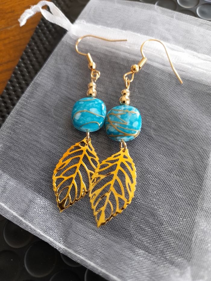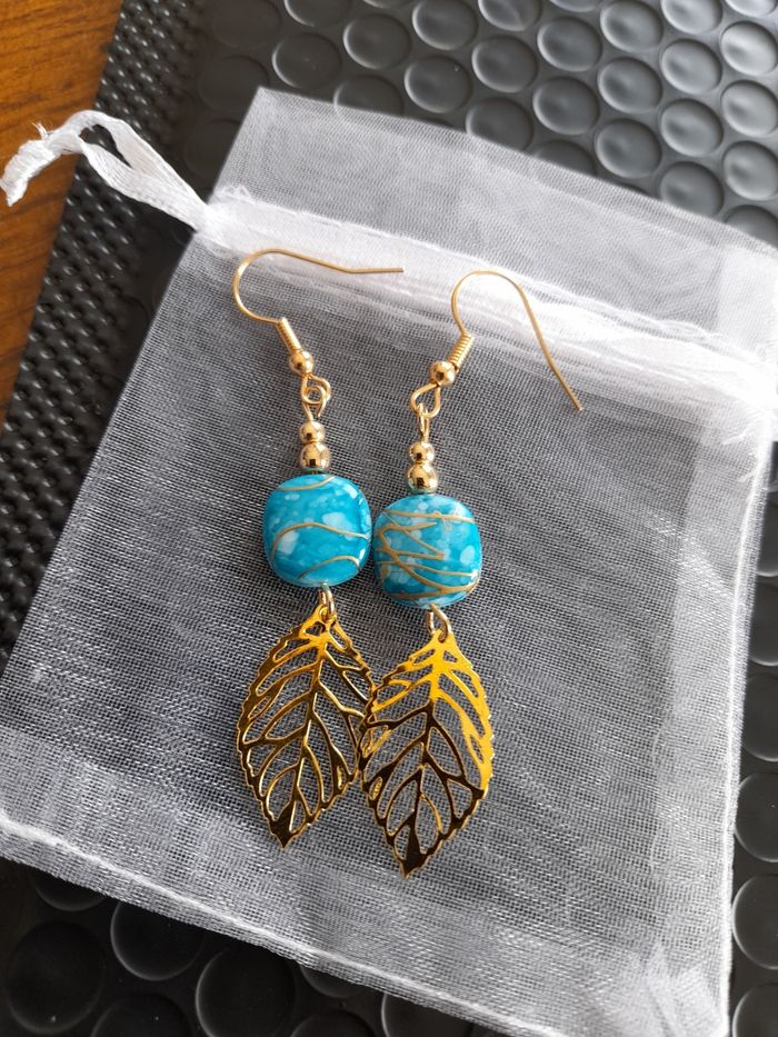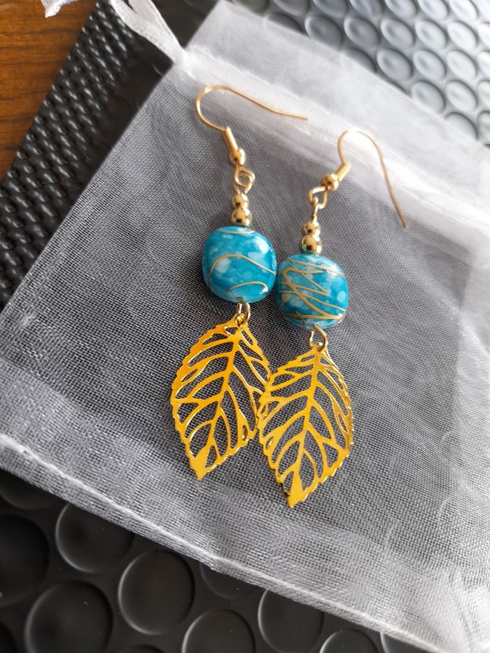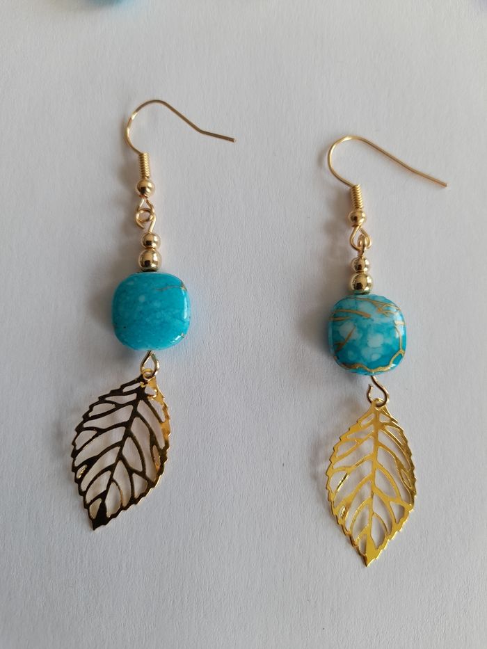 Boucles d'oreilles ornés de perles bleu turquoise et doré en acrylique avec breloques feuilles dorés. 7€ la paire Fait main ✋ par mes soins N'hésitez pas à me contacter pour toute demande complémentaire ;)