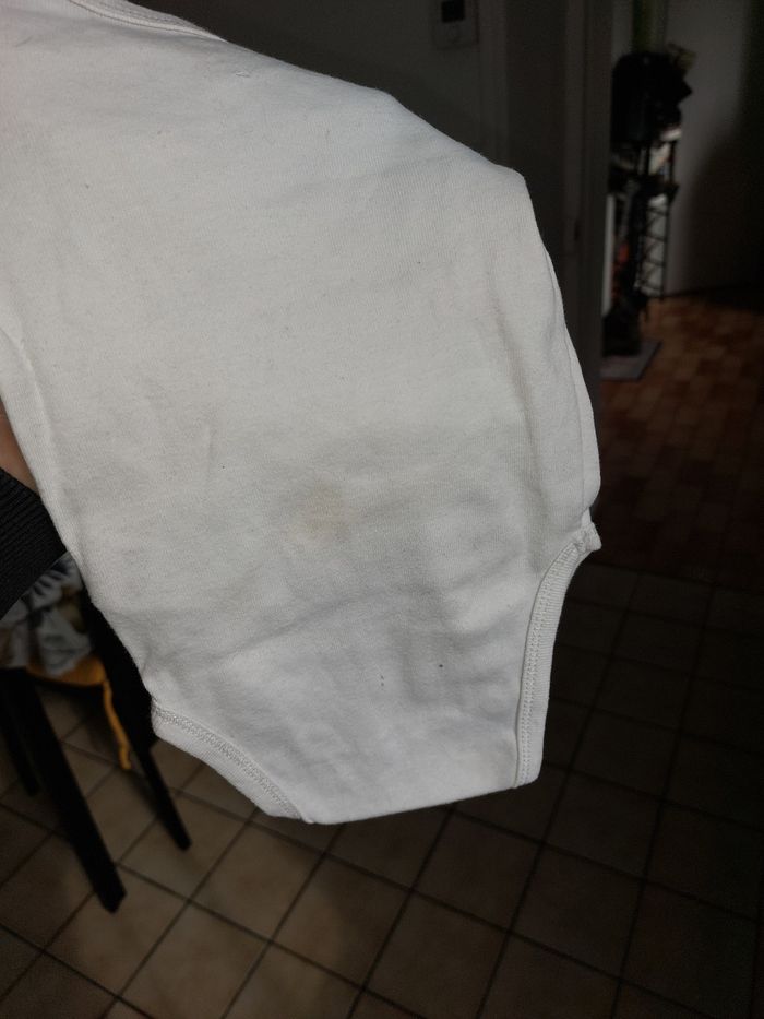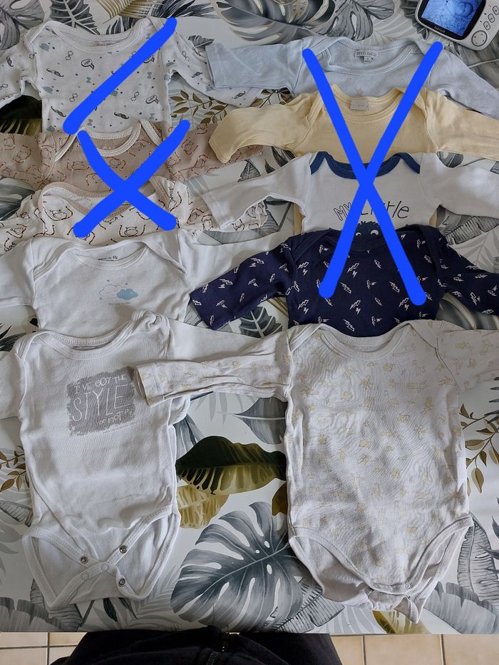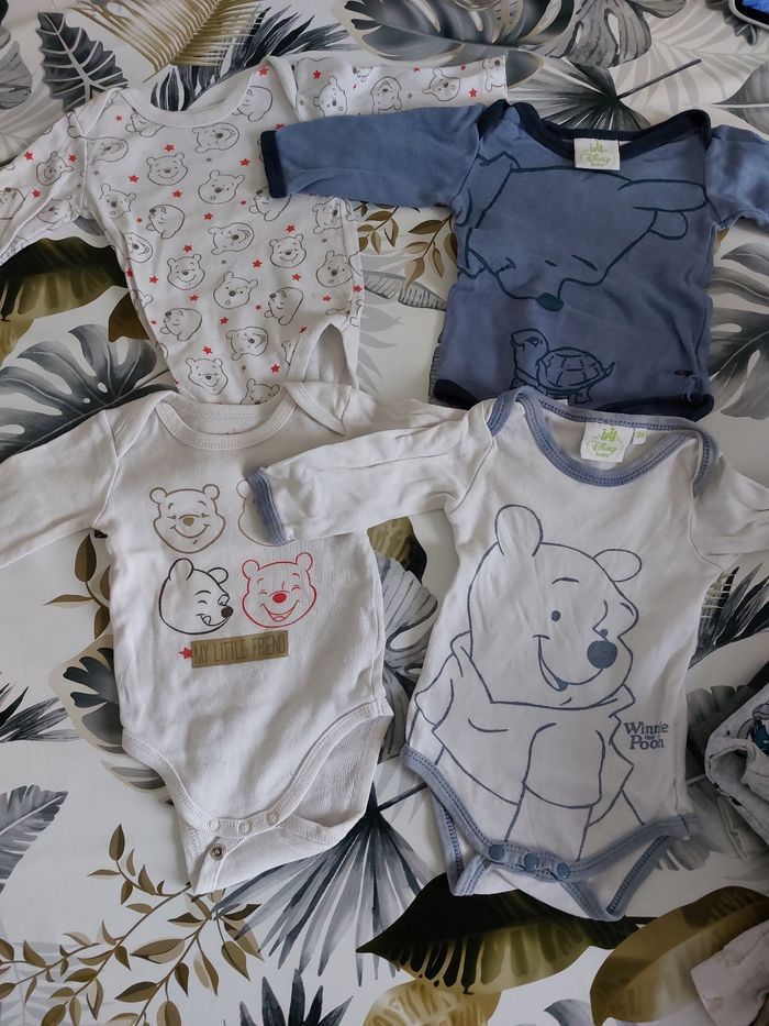 10 body manche courte et 9 manche longue. Une tache sur le winni l'ourson au fesse et une sur un body blanc. 0.50€ le body