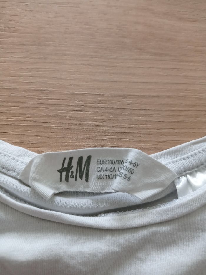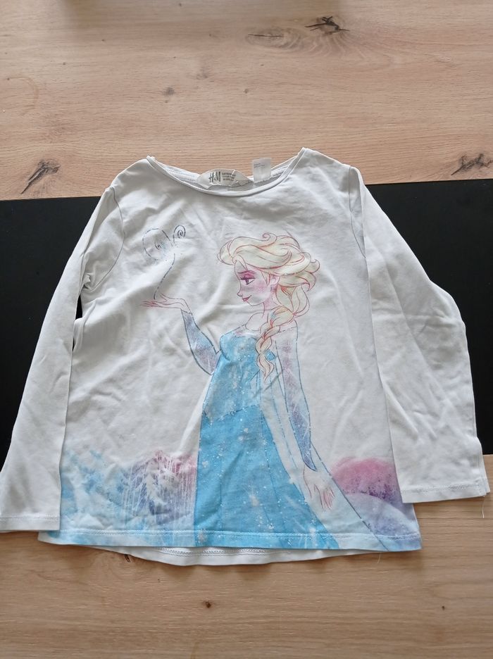 T-shirt blanc Elsa de la reine des neiges. ⚠️ Légère tache rouge sur le devant ⚠️ Marque : H&M Taille : 4/6 ans 110/116 cm