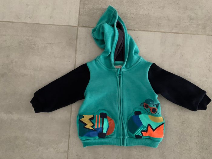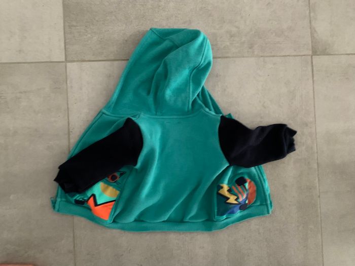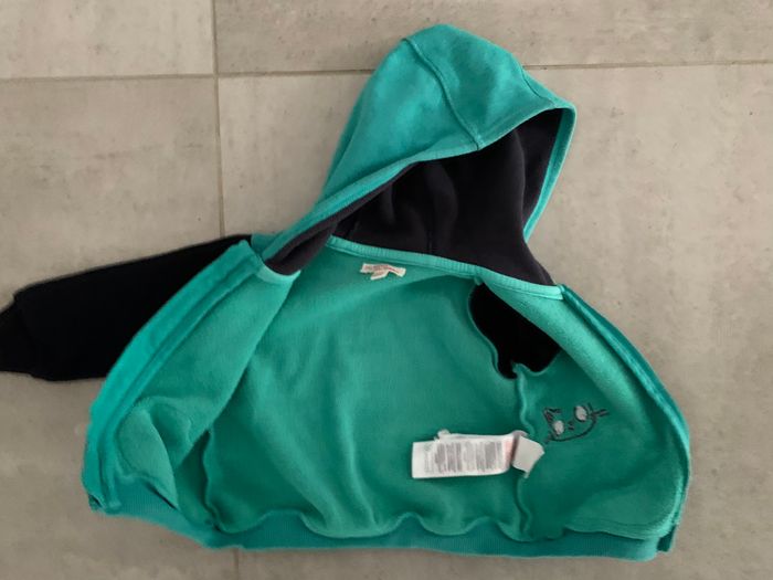 Veste / gilet de type sweat Très bon état Idéal pour pour les mi saisons J’ai pu mettre ce gilet à mon fils qui est de grand gabarit jusqu’à 15 mois, il est de très bonne qualité et extensible