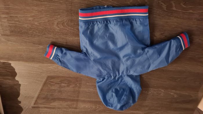 Veste de pluie bleu 3 mois Porte par mes 2 garçons mais elle et propre Il y a ni trou ni tache il y a un peu le dessin du robot qui commence à s'efface à force de la laver.