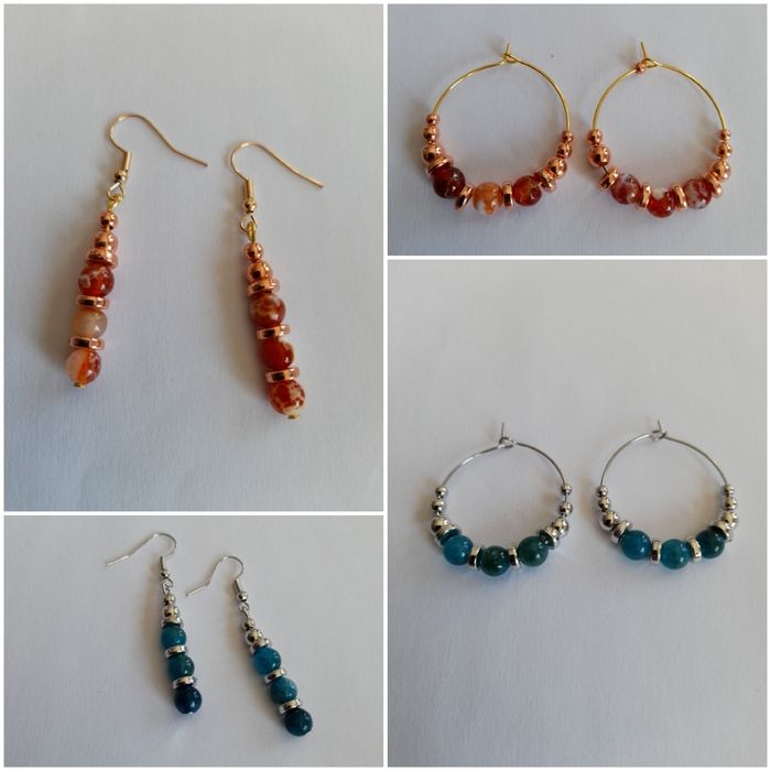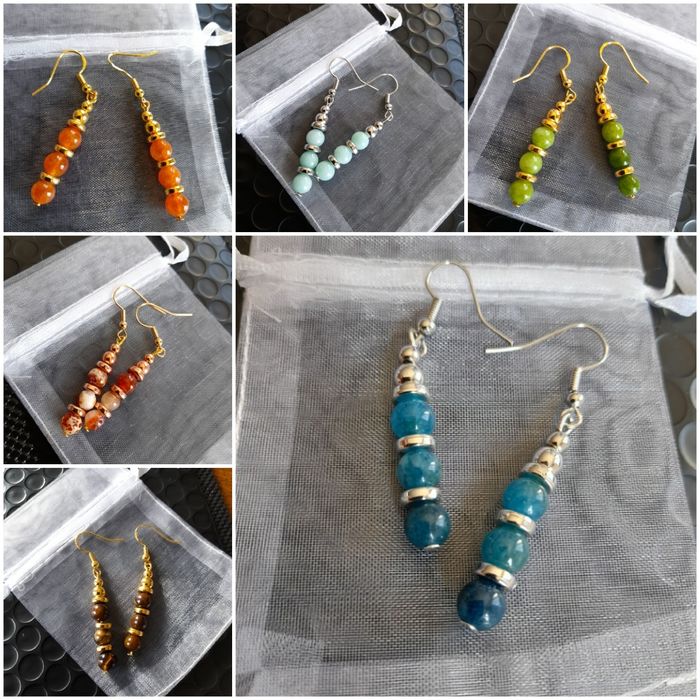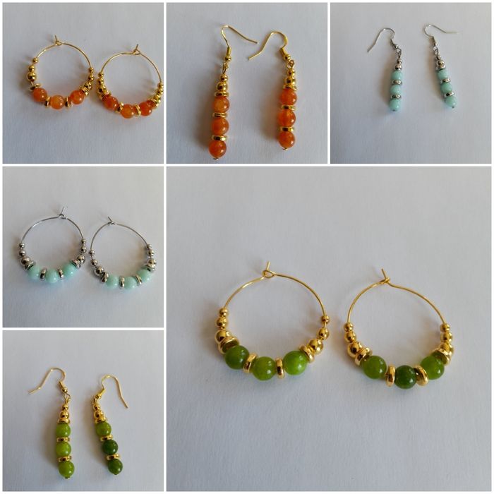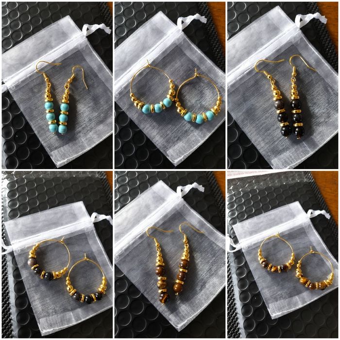 Boucles d'oreilles pendantes ou créoles en acier inoxydable doré ou argenté. Ornées de perles dorées ou argentées et pierres naturelles au choix: Turquoise (bleu turquoise), Œil du tigre (brun), Obsidienne (noir), Apatite (bleu foncé), Agathe de feu (rouge), Olivine (vert), Amazonite (bleu clair), Pierre de soleil (orange). Fait main ✋ par mes soins. 11€ la paire au choix. N'hésitez pas à me contacter pour toutes demandes complémentaires ;)