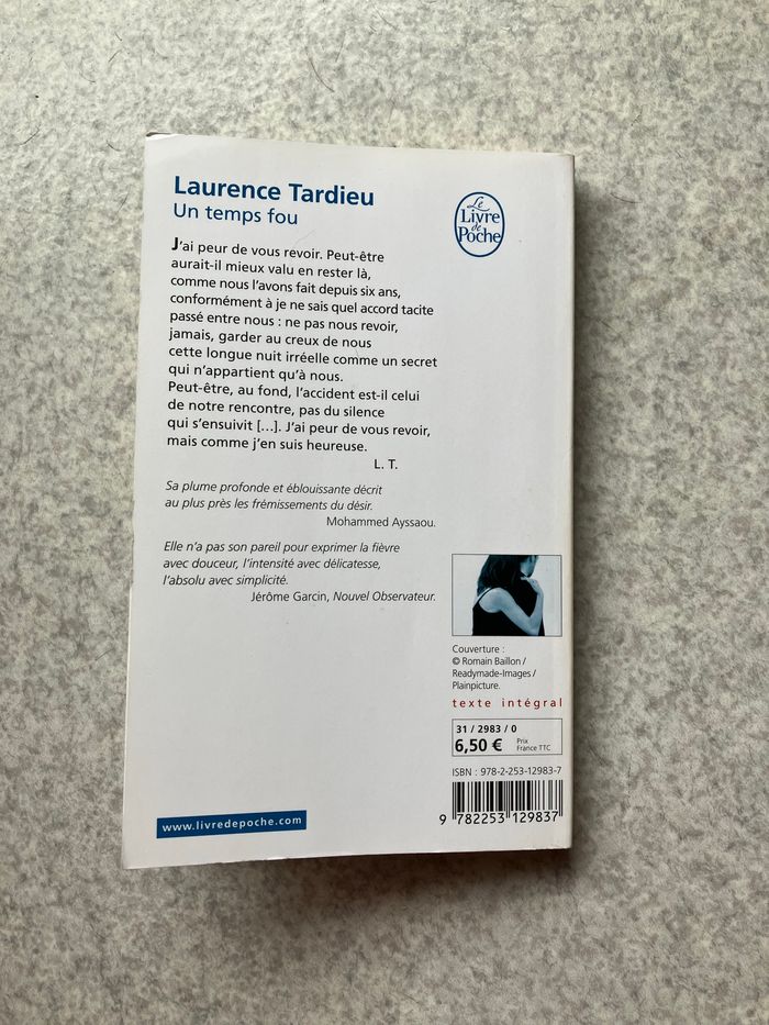 Un temps fou de Laurence Tardieu ~ Le livre de poche ~ Dépôt légal: Mars 2010 ~ Roman de 219 pages (6€50) ~ Qlqes imperfections dont la tranche pliée mais reste en état très correct ~ Vendu 1€80 ~ Autres livres disponibles également dans ce dressing et via mon profil V****d (romances, thrillers psychologiques, etc)