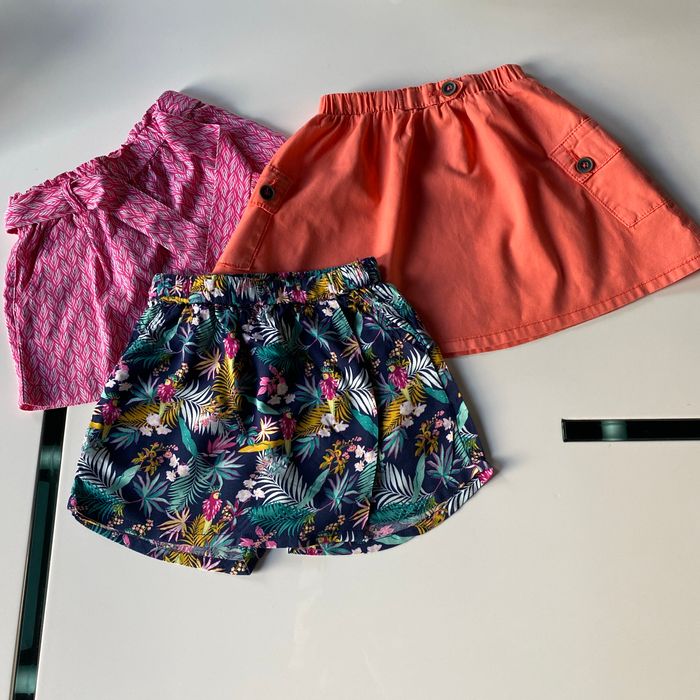 Prix ferme ! Lot comprenant un short rose avec ceinture Okaidi Une jupe short colorée vert rose marine marque Tape à l’œil Et une jupe orange poches sur les côtés marque Tape à l’œil Les 3 articles ont un élastique à la taille 3 ans 96/98 cms