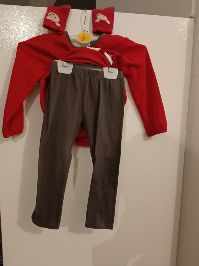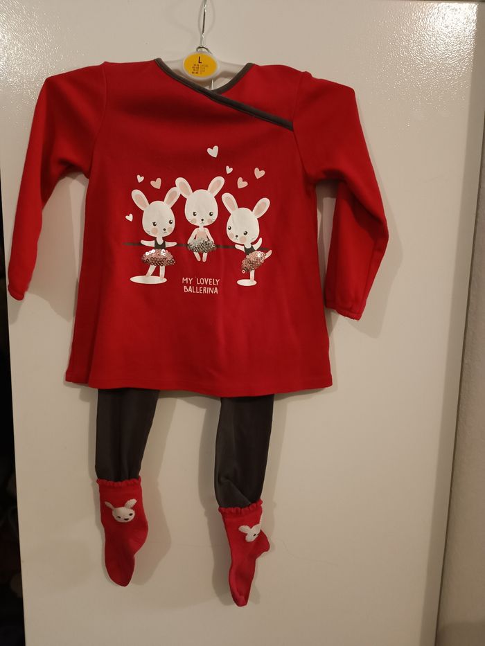 Ensemble t-shirt, leggings et chaussettes. Sur la photo le t-shirt fait rouge mais il est rose foncé. Le legging et gris foncé.