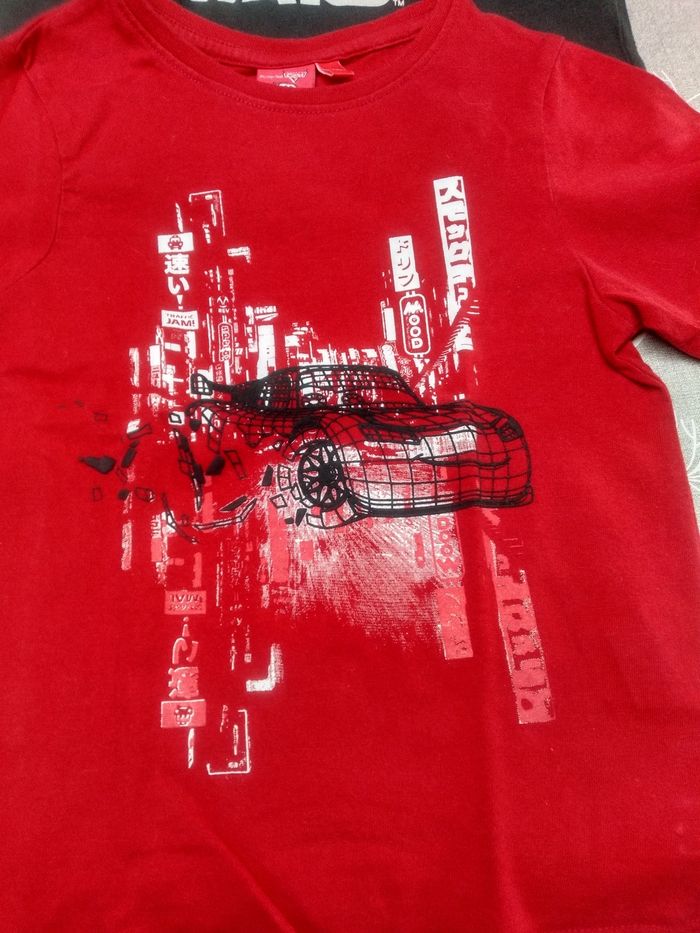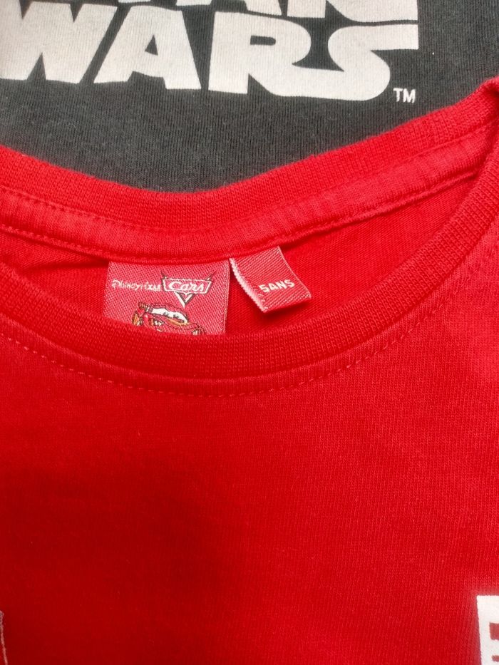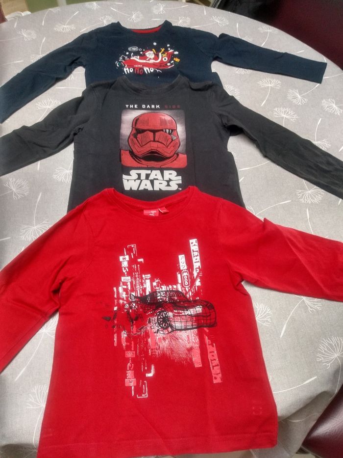 Lot de 3 t-shirts manches longues. Taille 5 ans. Marque : Kiabi, Star Wars et Disney. un Noêl, un star wars et un Cars. Très bon état. Star Wars, bon état. Bac 13