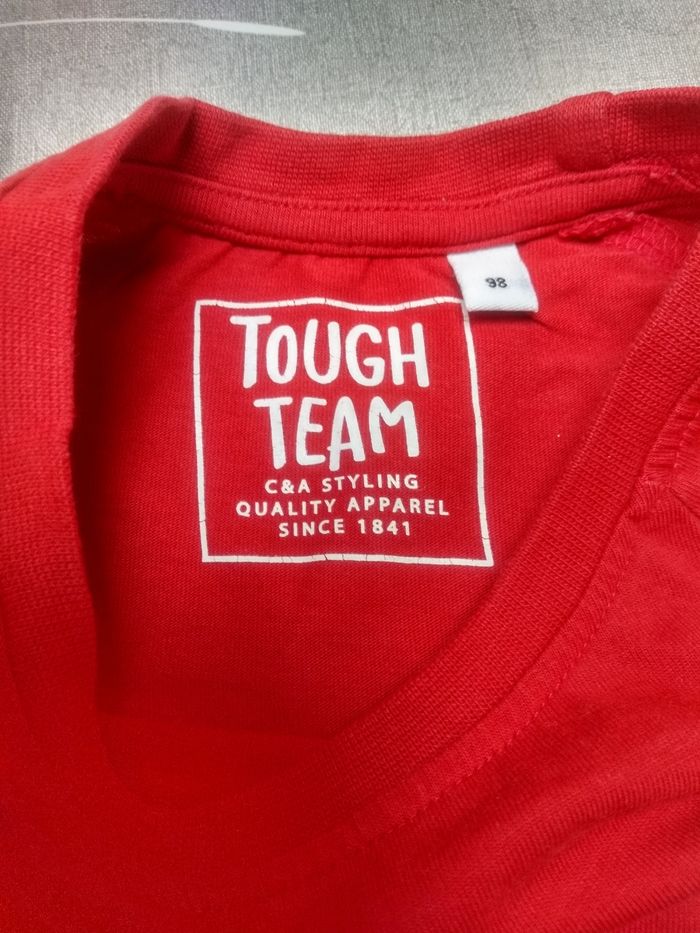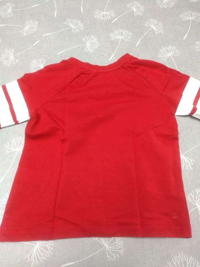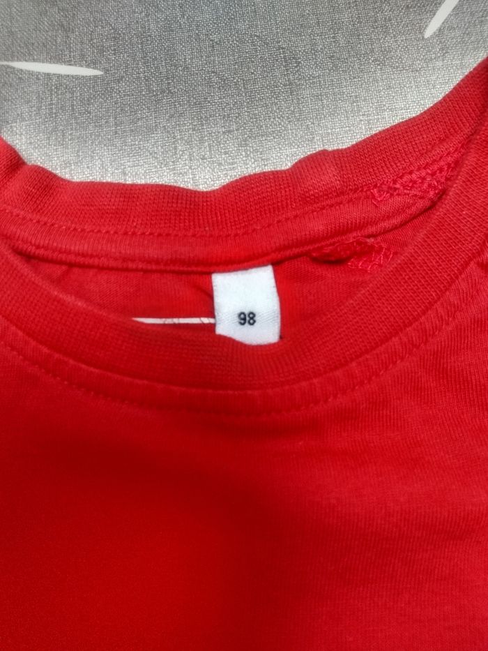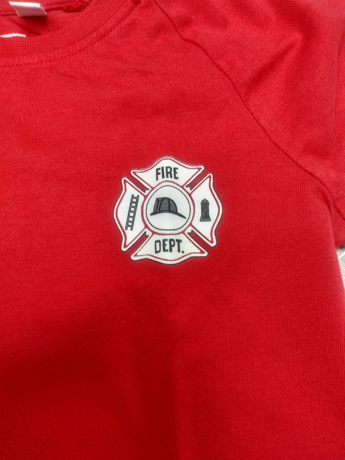 T-shirt manches longues rouge avec insigne de pompiers. Taille 98. Marque C&A. Très bon état. Bac 13