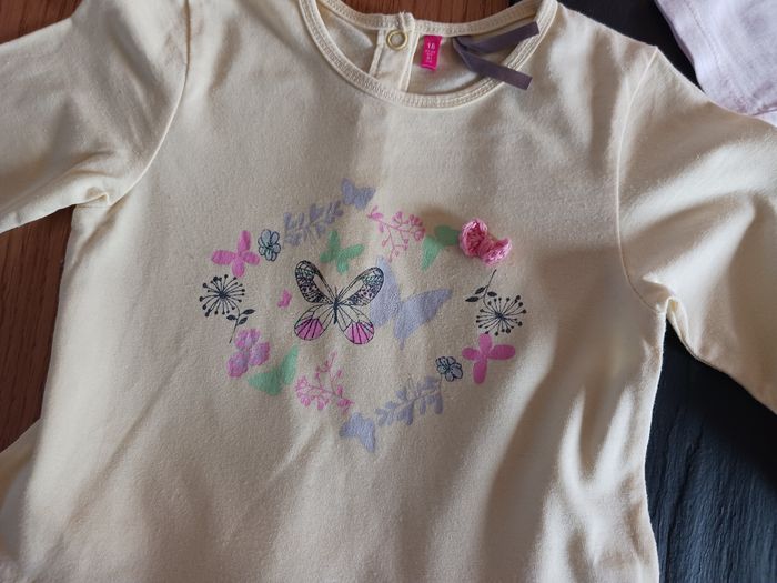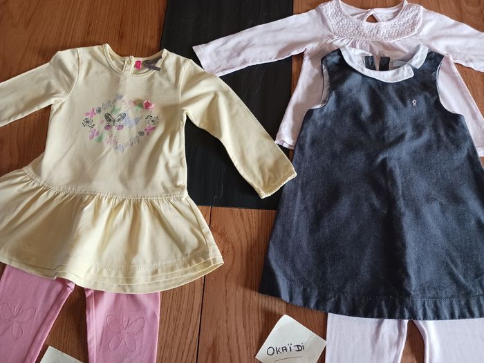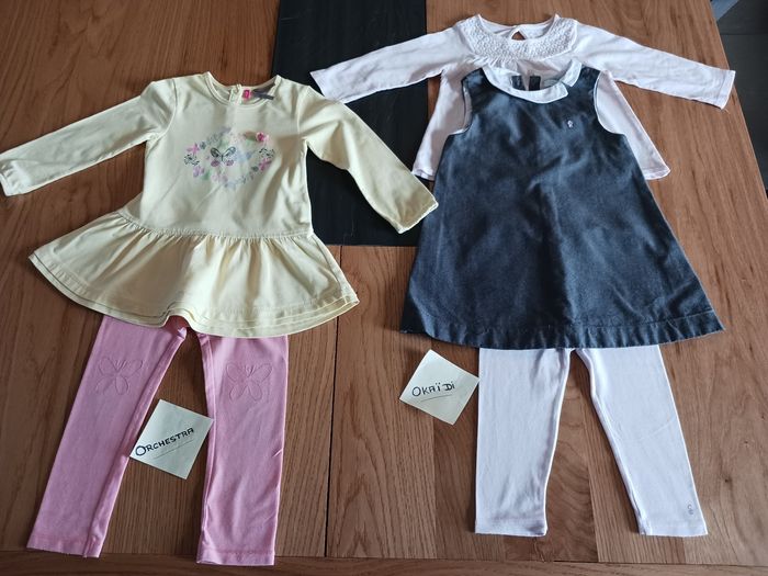 Ensembles: - 1 robe jaune motifs 🦋 + legging rose Orchestra - 1 robe sans manche style jeans + t-shirt manches longues et leggin rose très clair Okaïdi