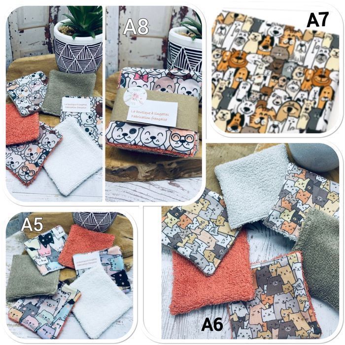 lingettes lavable et réutilisable lot de 8 taille 9x9cm avec un côté en éponge coton tout doux Facile d’entretien séchage rapide lavable à 30° pas de sèche linge pensez à humidifier la lingette avant utilisation plusieurs modèles au choix Envoi rapide et soigné Toutes les lingettes sur @ateliersdisalingettes Merci de m’indiquer le numéro de lingettes possibilité de faire en plus grande quantité Possible de faire le panier assorti à 10€