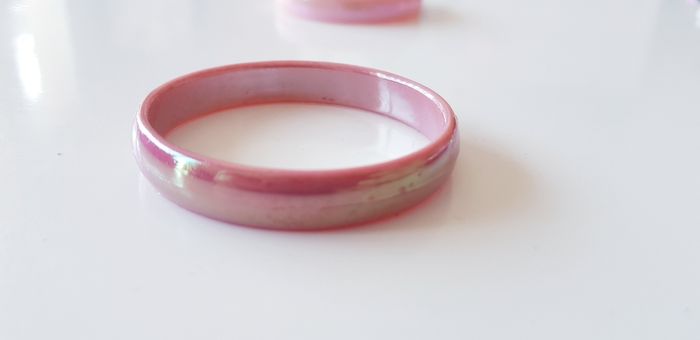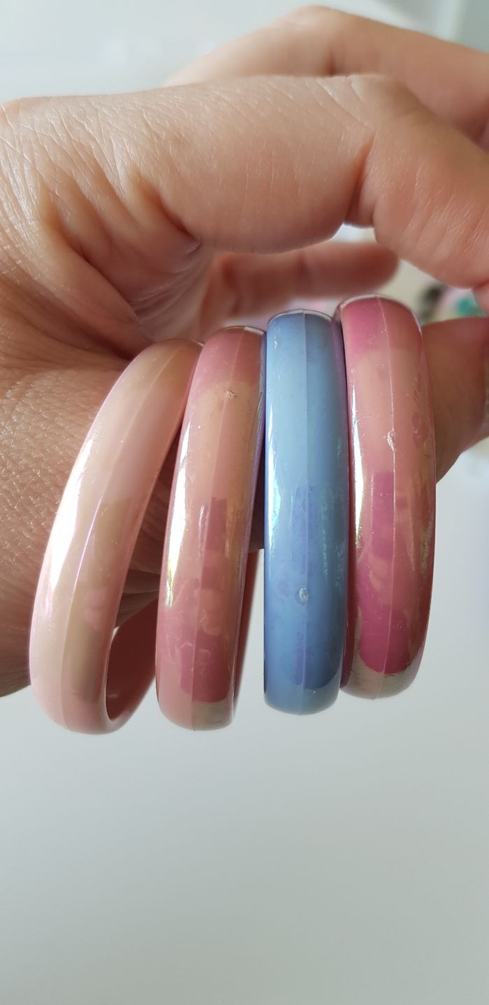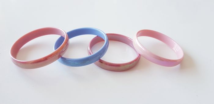 Lot de 4 bracelets irisés Plastique Achetés à Kiabi Peu portes mais quelques marques. Sinon très bon état. Bijoux