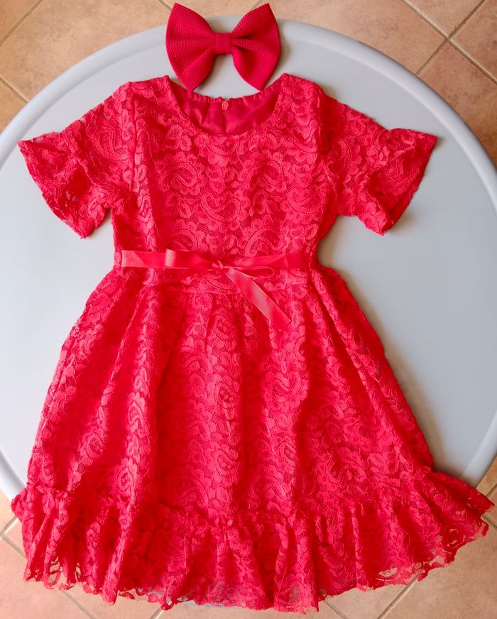 Ensemble Jolie robe rouge en dentelle, barrette gros noeud assortie