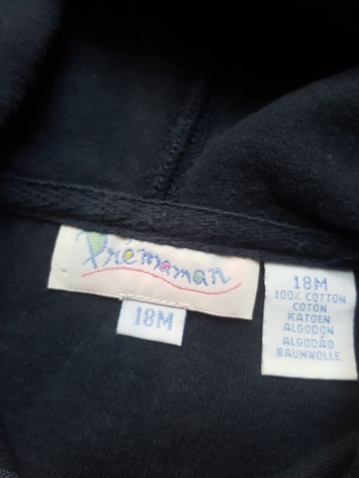 Gilet à capuche taille 18 mois. Porté plusieurs fois. Tissus légèrement plucheux et bouloché mais pas de tâches ou de trous.