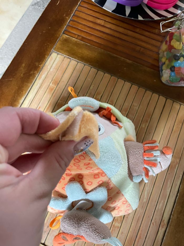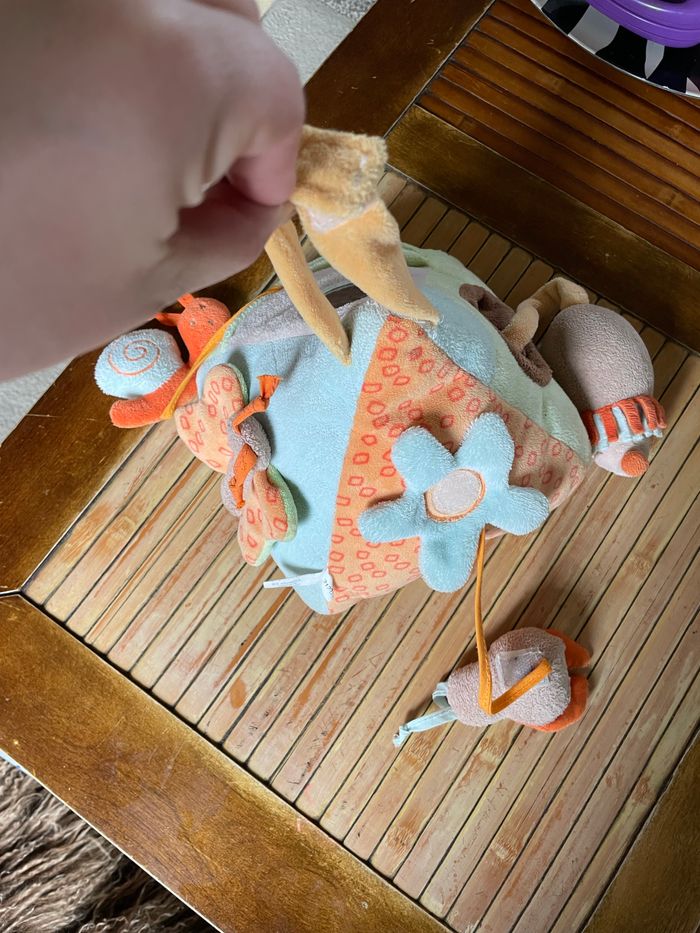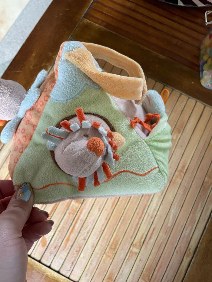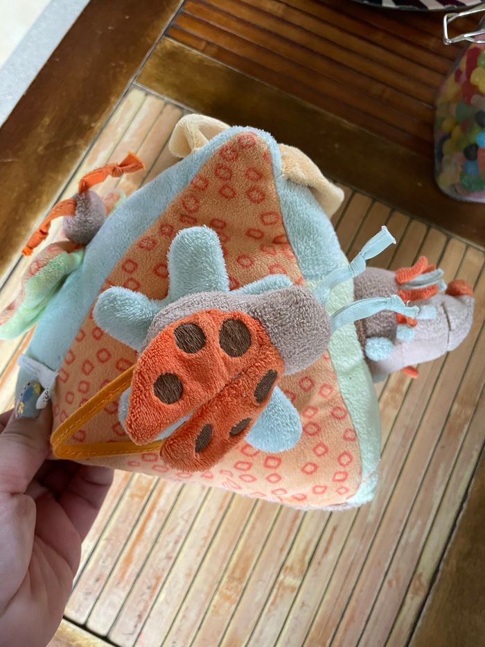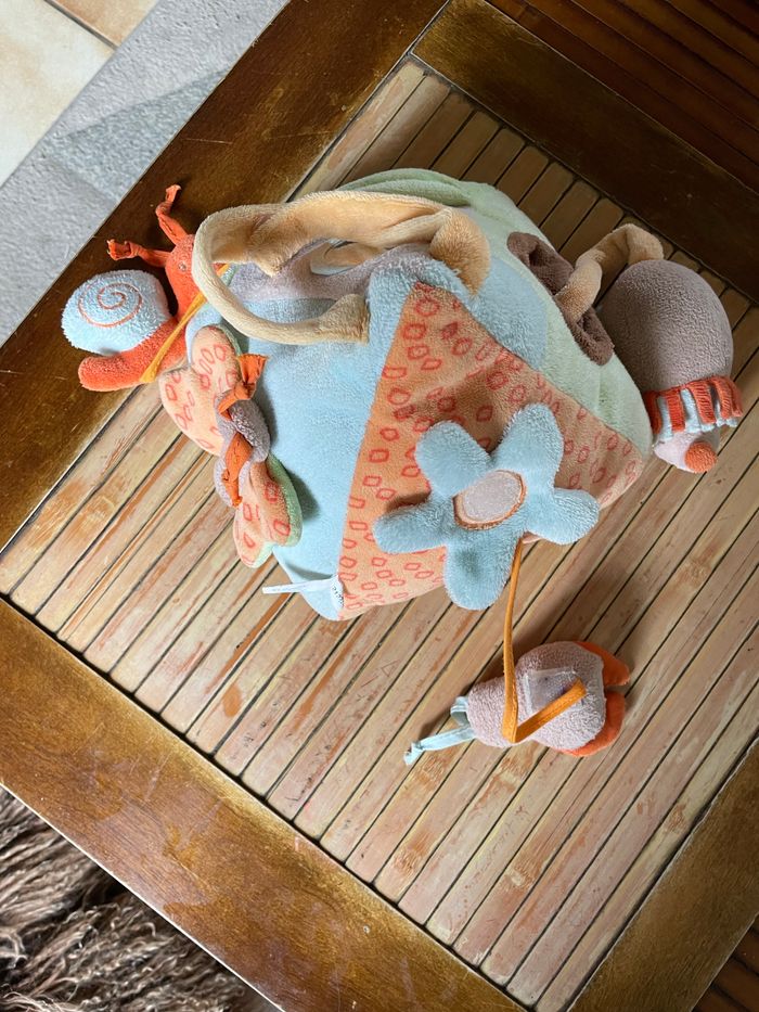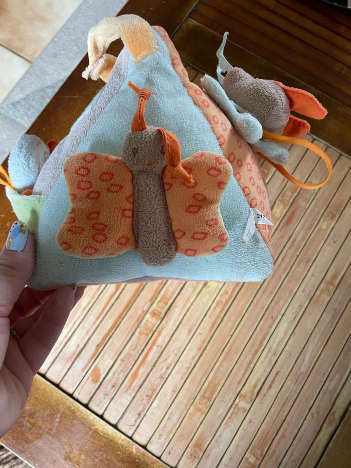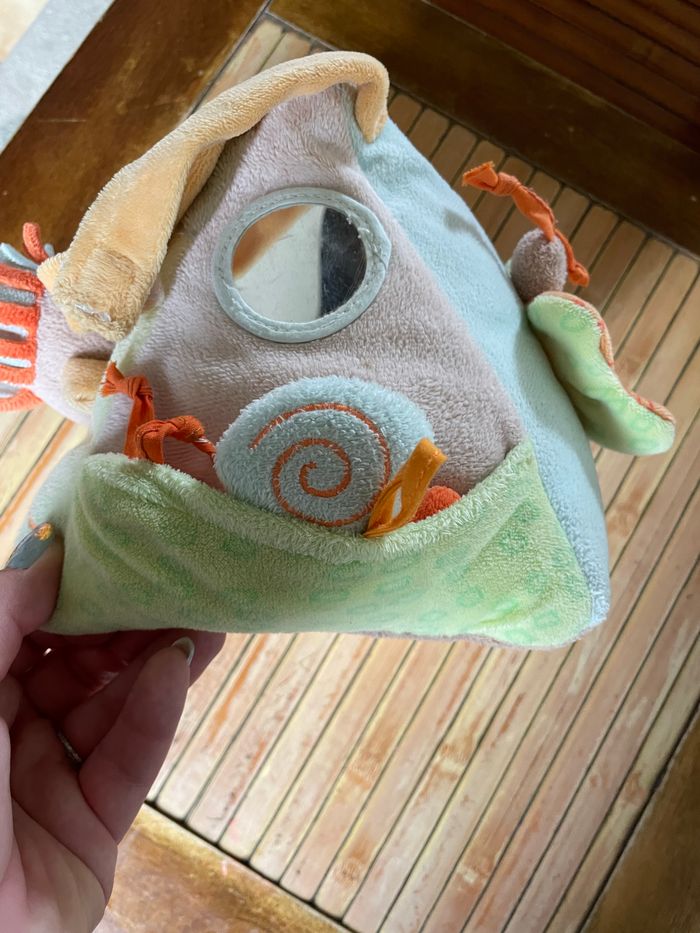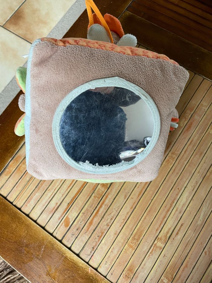 Jouet à accrocher pour poussette ou autre En matière douce, sensoriel avec différents bruit Miroir un peu rayé voir photo. Bon état