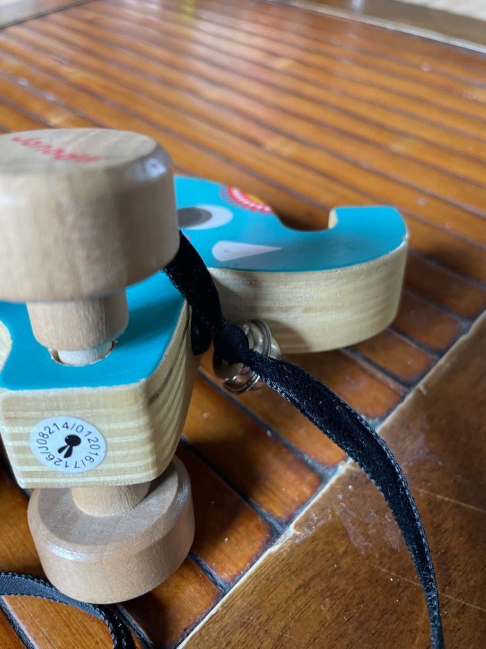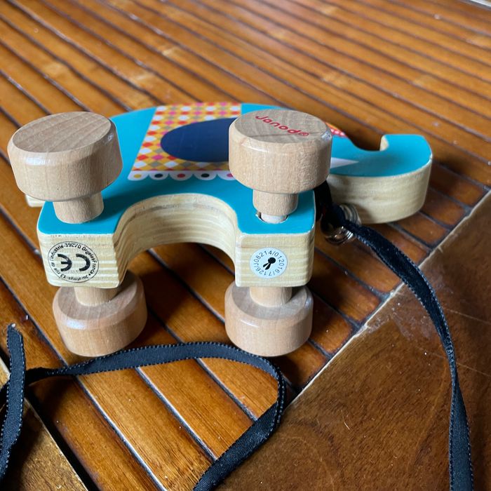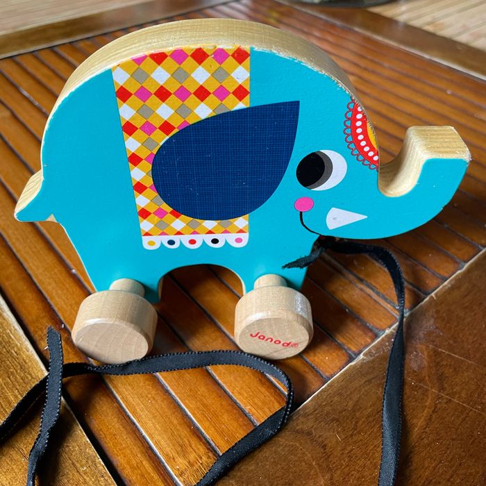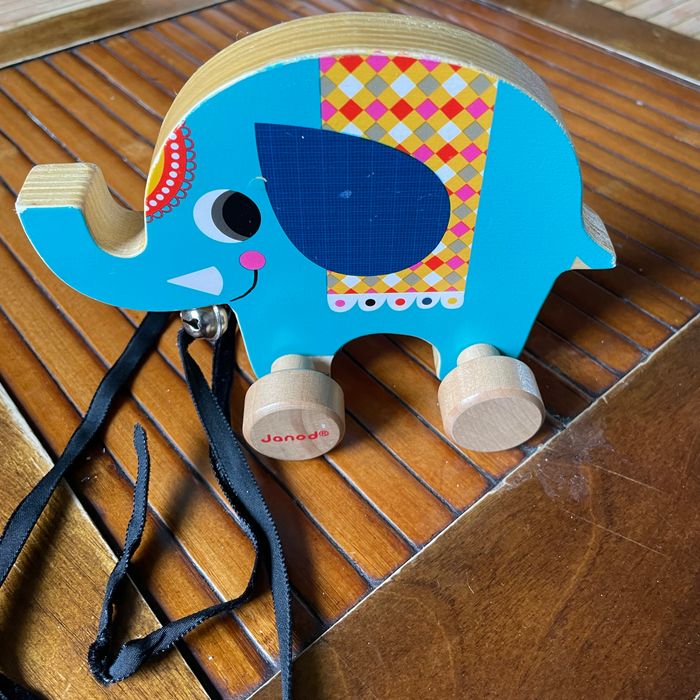 Jouet à tirer éléphant en bois Acheté sans ficelle donc rajout d’un ruban. Bon état