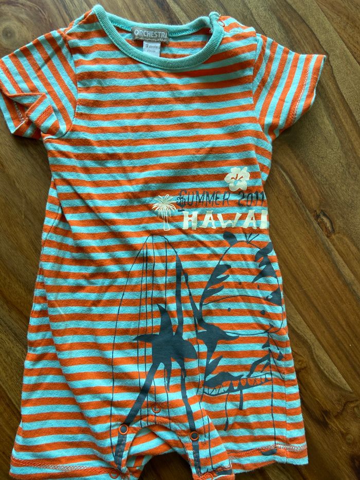 Combinaison été rayé orange et bleu motif zébre et écriture Orchestra 9 mois