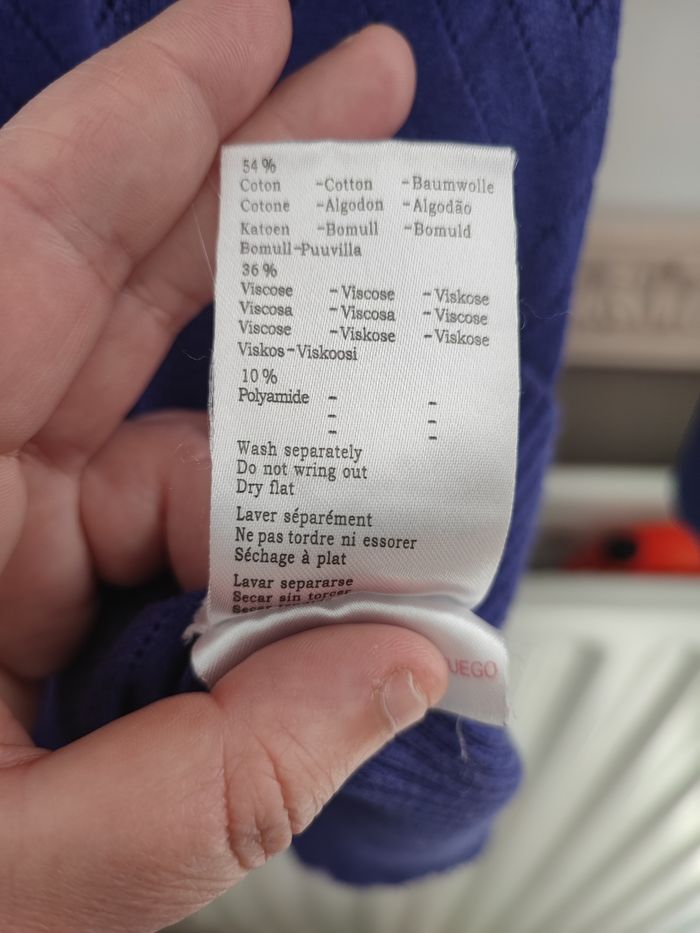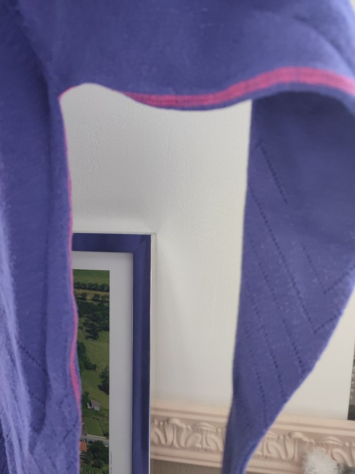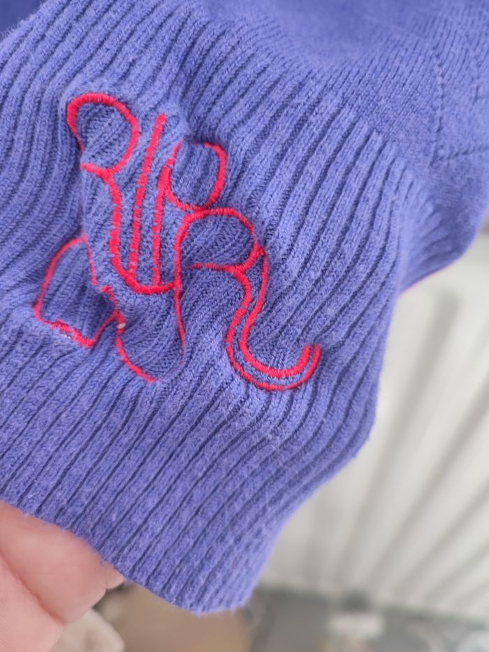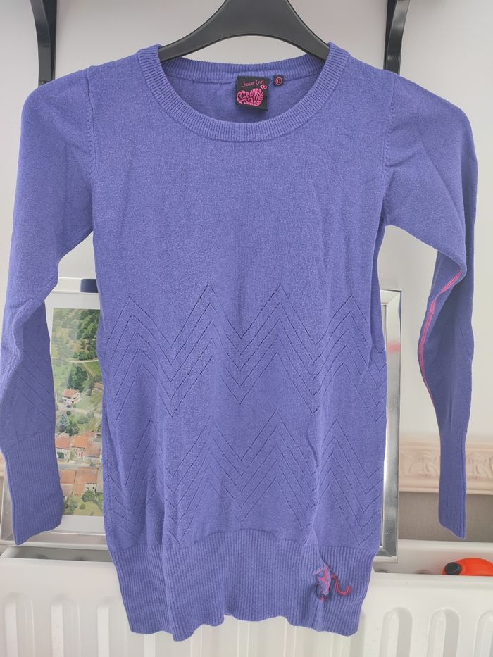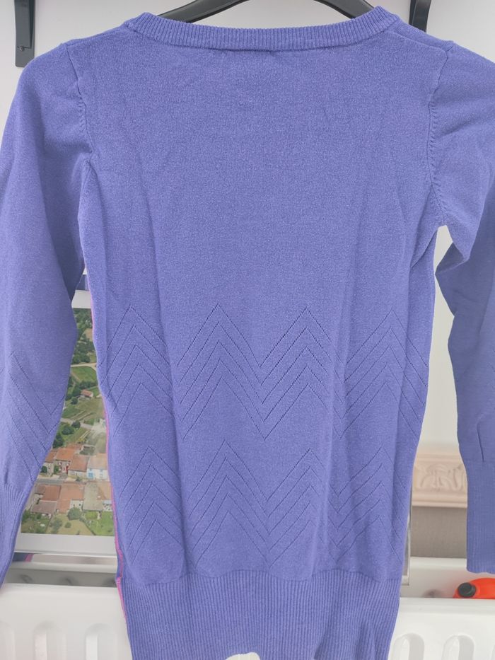 Pull long de couleur bleu foncé (pas marine) où violet foncé (on est pas d'accord dans la famille..) avec liseret fushia d'un côté Taille 12 ans, quelques bouloches