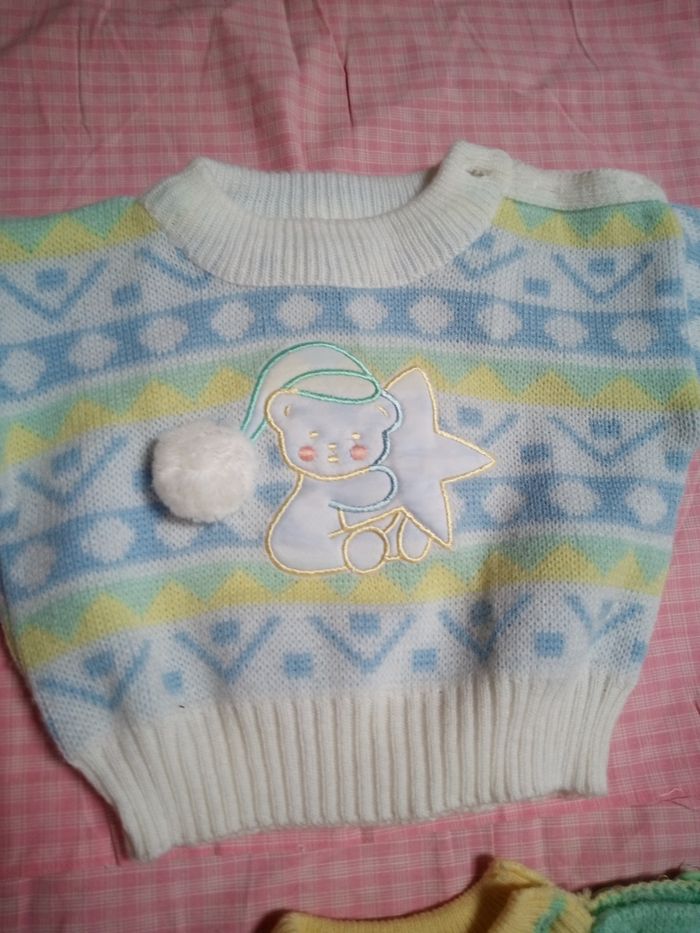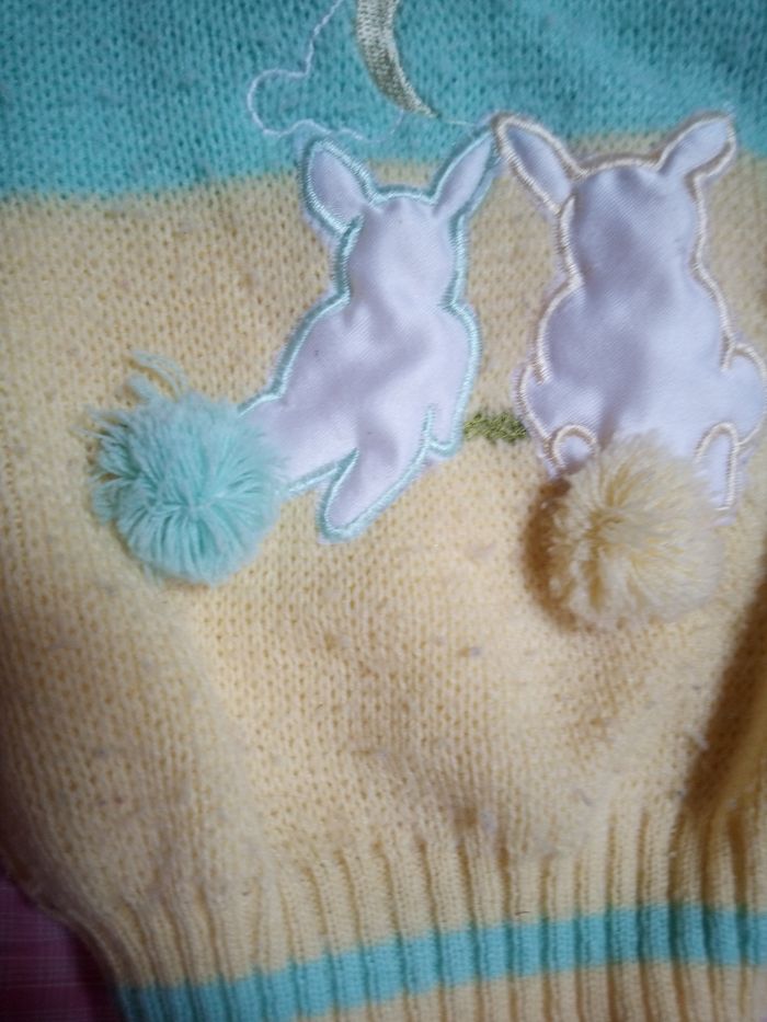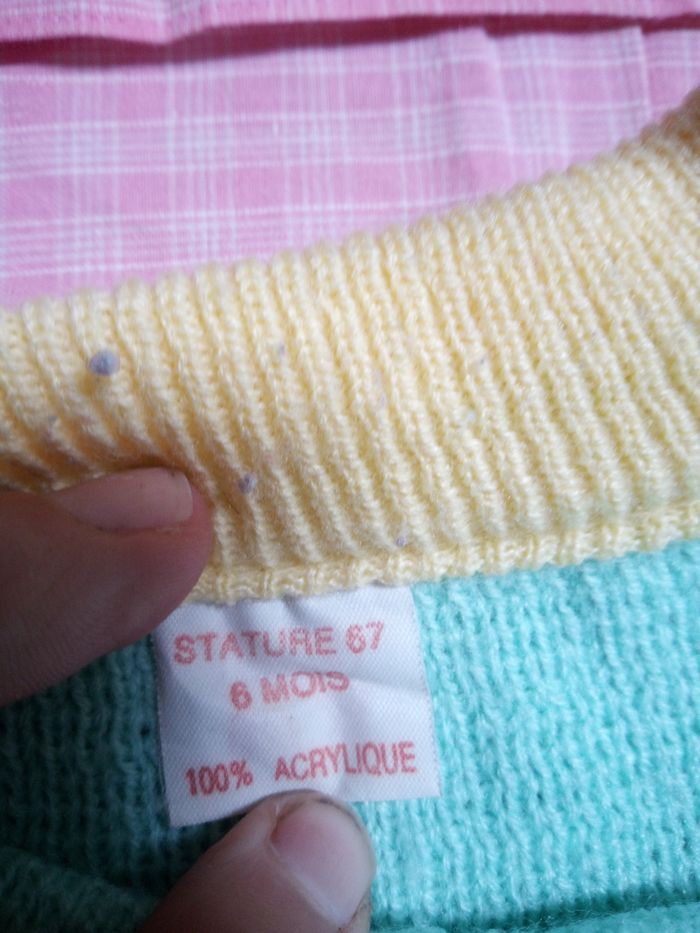 Bonjour vend deux pulls en acrylique en 6 mois le jaune a des peluches comme sur la photo 2