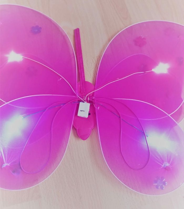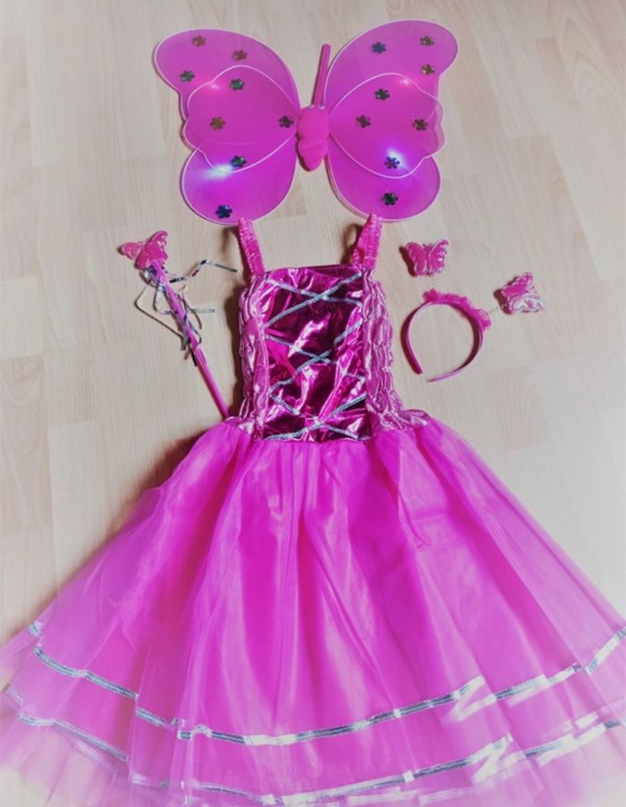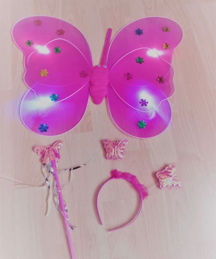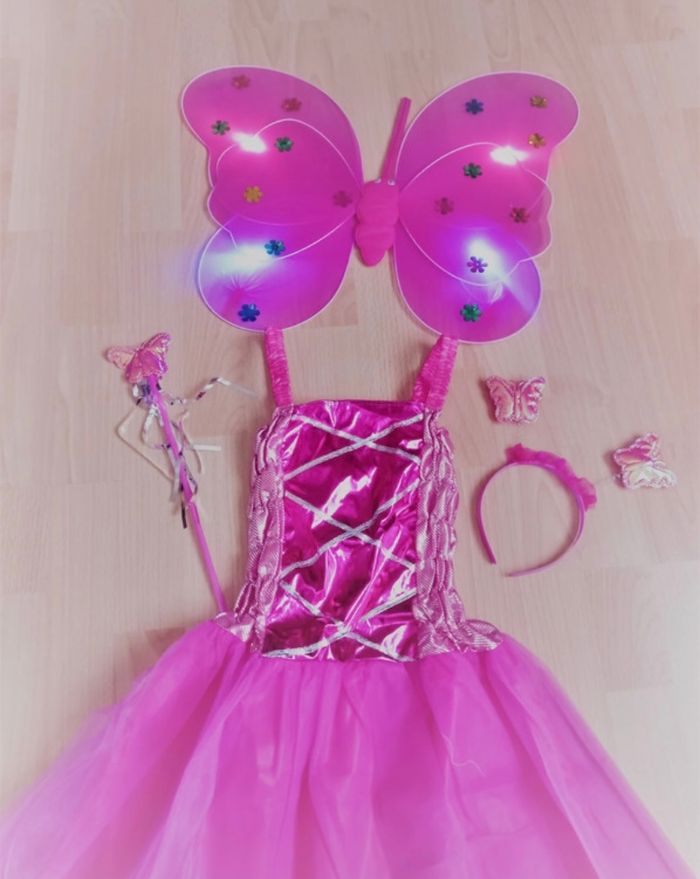 Déguisement robe princesse aile de papillon LED et ces accessoires. La robe mesure 80cm, la taille convient aux petites filles de 5-6ans. Totalement neuve, vendue dans son emballage d’origine. Expédition rapide après votre commande