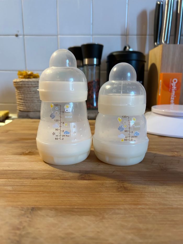 Deux biberons MAM sans tétine. 1 biberon contenance maximum 160 ml 1 biberon contenance maximum 130 ml