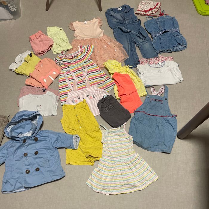 - veste printemps (un peu taché) - 5 robes - 2 combi short - 2 shorts - 2 t shirt manches longues - 8 t shirts manches courtes - 1 chapeau