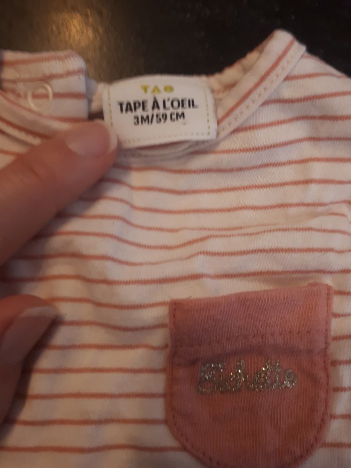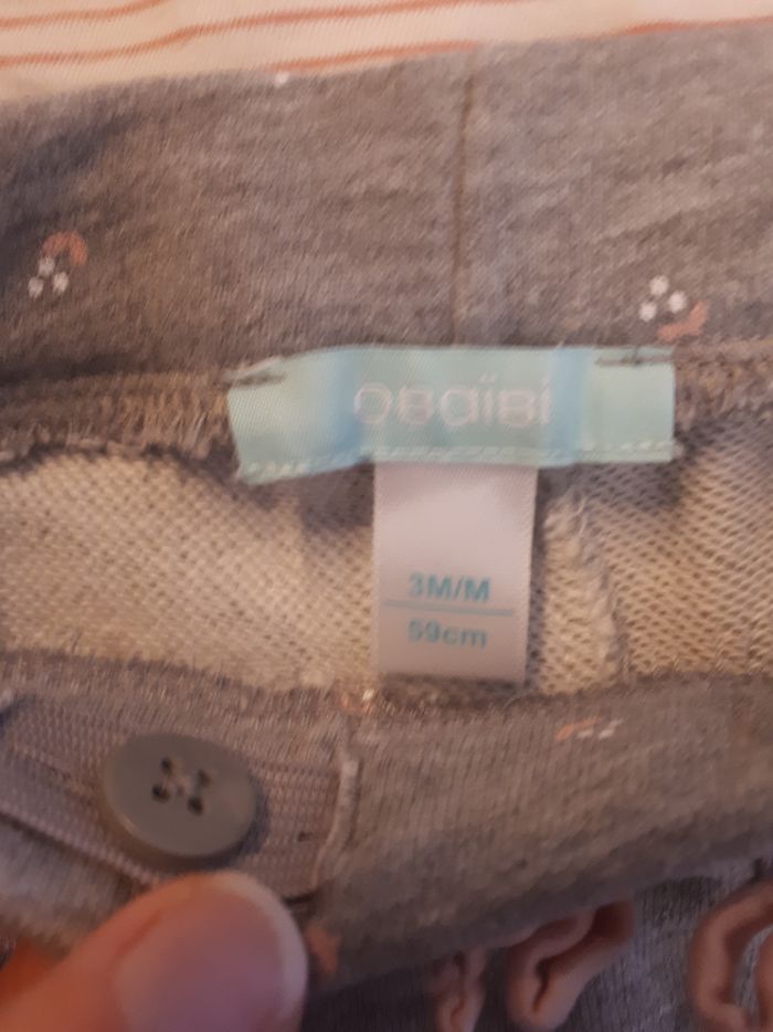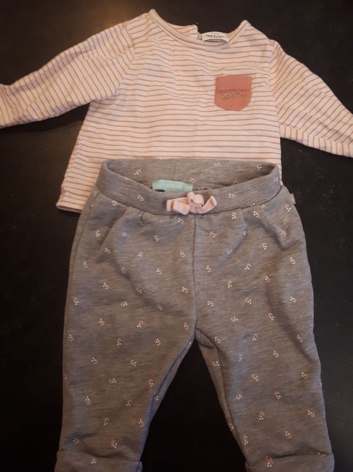 Jogging Obaibi gris avec fleur blanche et rose Haut TAO rayé Blanc et rose avec bouton pression Taille 3 mois Très bon état