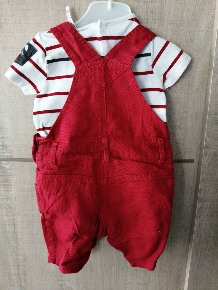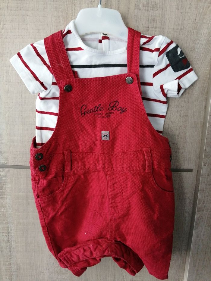 Ensemble salopette courte et tee-shirt manches courtes. Pratique avec ces boutons pression en bas pour changer la couche. Très bon état car très peu porté.