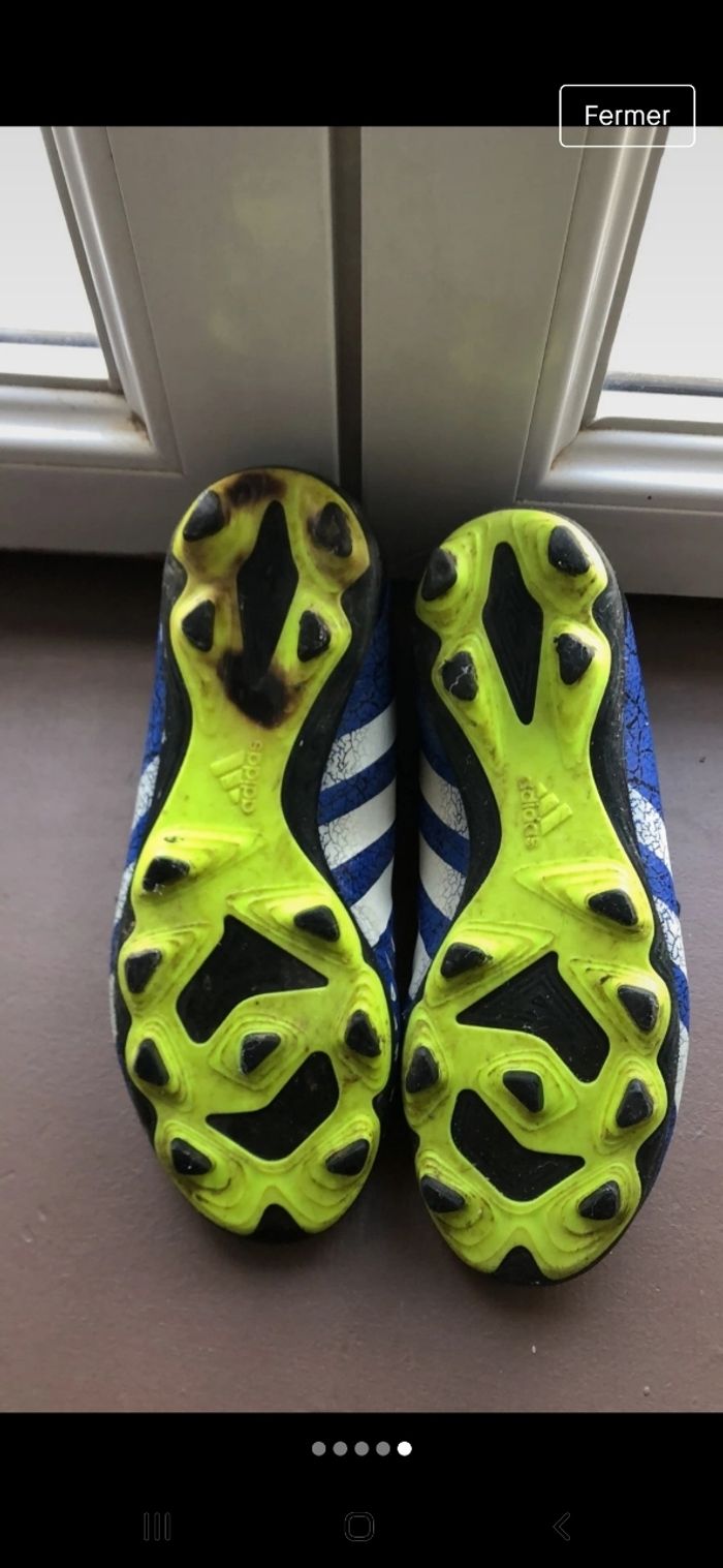 Chaussure de foot moulée adidas predator sur la chaussure gauche mon fils l’avait mis sur le radiateur hormis sa l’es chaussures on impeccable il a jouer une saison avec pointure 35