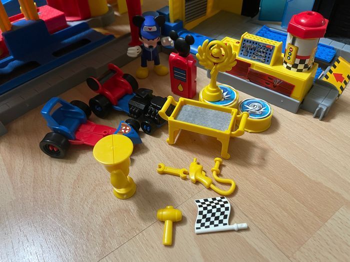 Garage Mickey, en très bon état, à part des stickers mal collés (je n’y arrive jamais). Manque quelques accessoires mais ce n’est pas dérangeant à l’utilisation. Sera envoyé monté, à part le toboggan qui se monte très facilement. La notice est fournie dans le colis 😉
