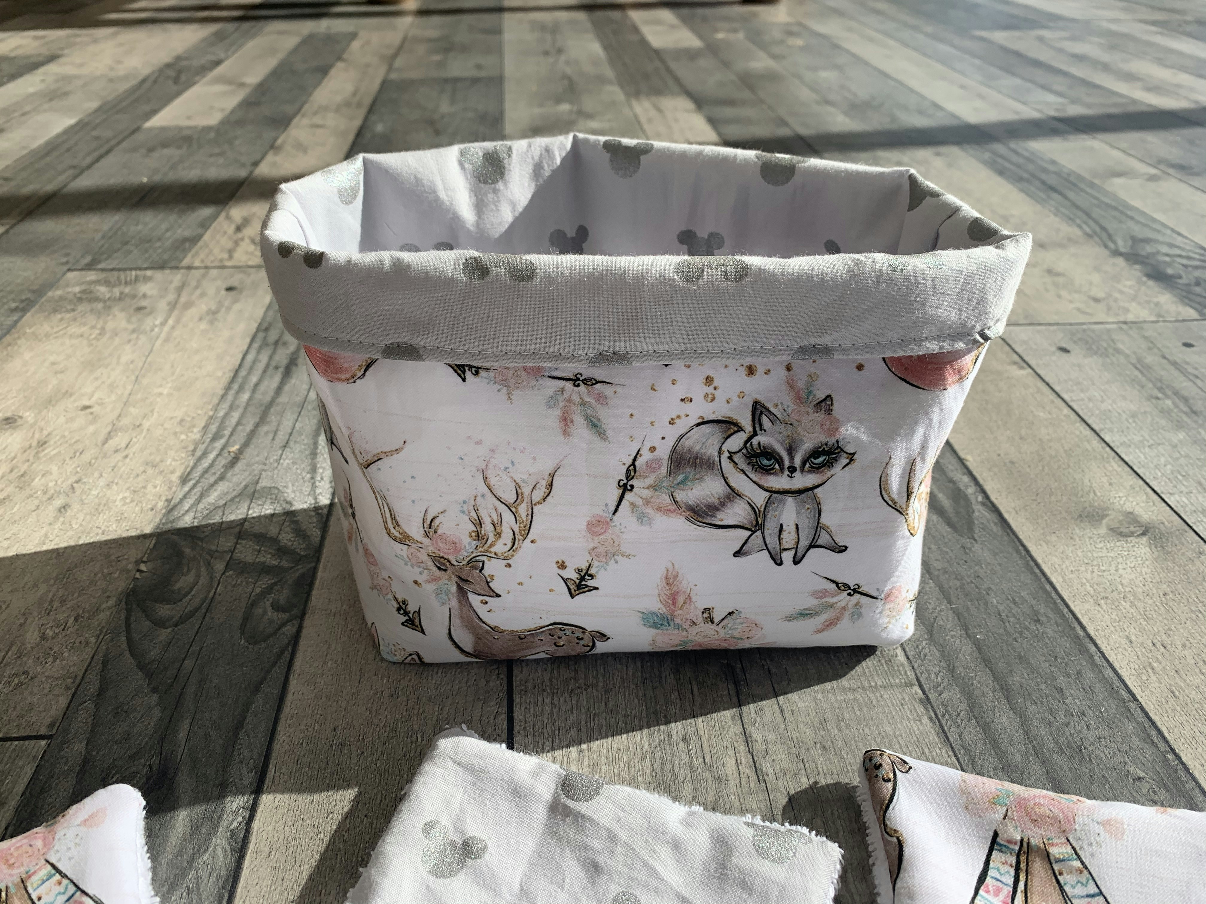 Panier accompagné de ses 9 lingettes lavables en coton imprimé et tissu éponge Fabrication artisanale