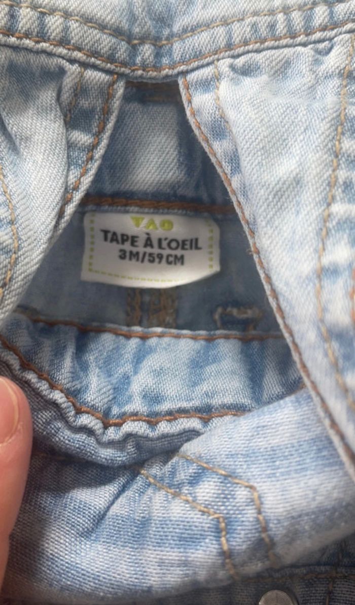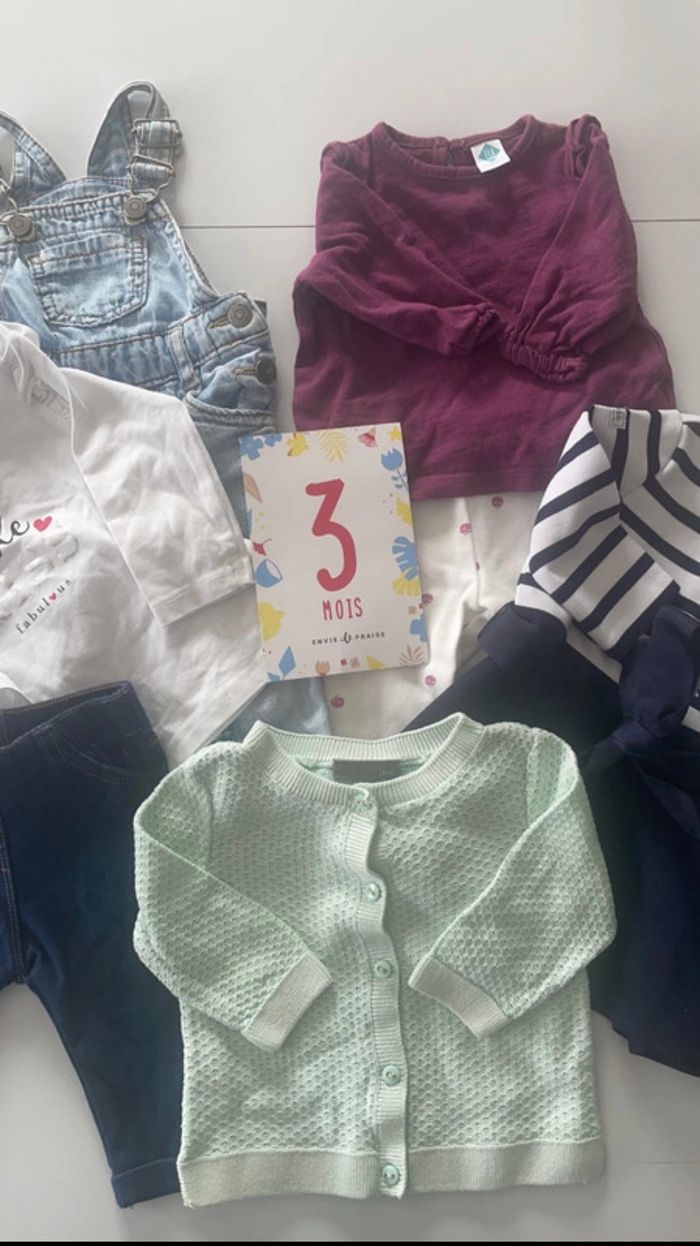 Lot vêtements 7 pièces 3 mois composé de 1 salopette en jean tape à l’œil (il y a écrit baby boy sur les boutons) avec pression à l’entre jambe pour changer la couche 1 ensemble tex top prune et pantalon blanc imprimé prune 1 top bel&bo baby blanc 1 jean très extensible Kiabi 1 robe sans marque bleu et blanche avec le petit short assorti 1 gilet JBC vert d’eau ⚠️ Lot non dissociable ➡️ D’autres lots et ensembles disponibles sur mon dressing