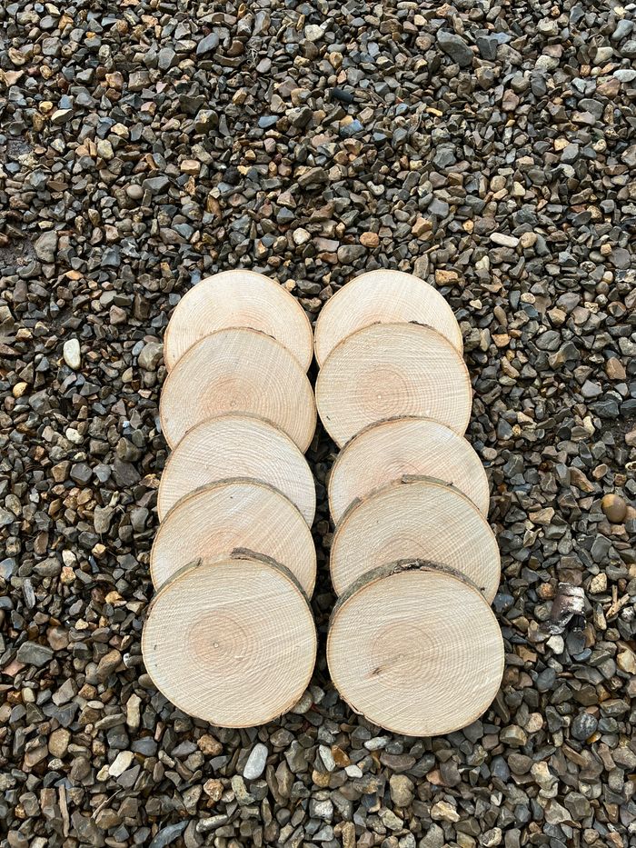 10 rondelles de bois diamètre environ 10/12cm Epaisseur de 1 à 2cm Essence: Frène Idéal pour atelier créatif, décors champêtres pour anniversaire, baptême, fêtes en tous genres. Différents diamètres disponibles (de 6 à 30cm) Il peut manquer des écorces sur certaines. Expédition uniquement par mondial relay
