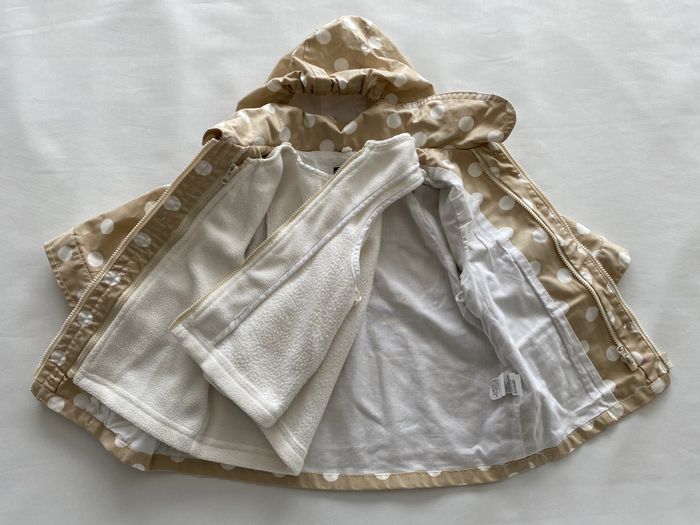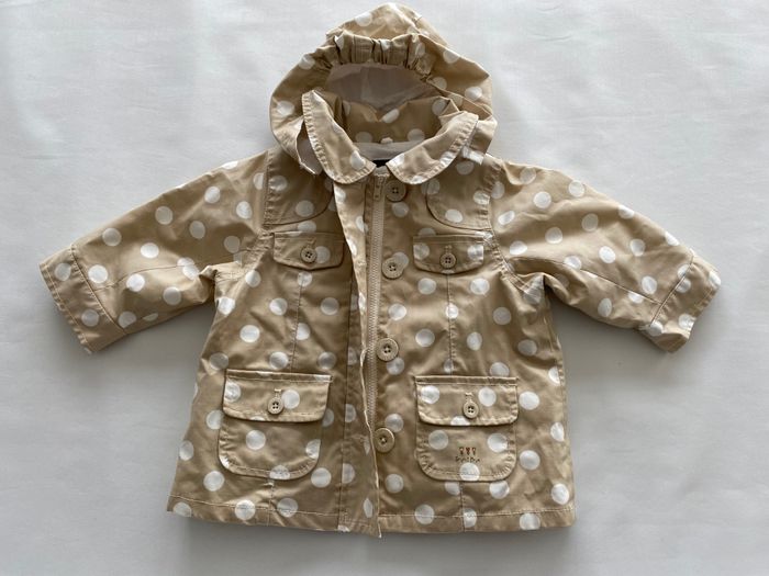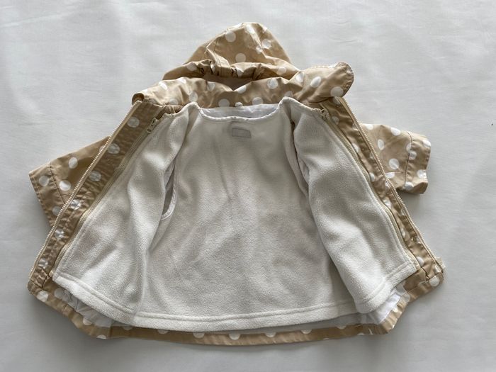 Manteau ciré beige avec motifs pois blancs. Ouverture avec boutons et fermeture éclair A l’intérieur doublure blanche amovible grâce à un système de fermetures éclair cachées à l’intérieur La capuche est également amovible grâce à des boutons pressions. Vsergentmajor3