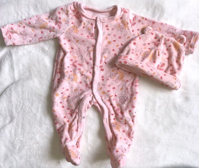 Vendu avec son petit bonnet, un petit pli au niveau des mains pour permettre de couvrir les mains de bebe