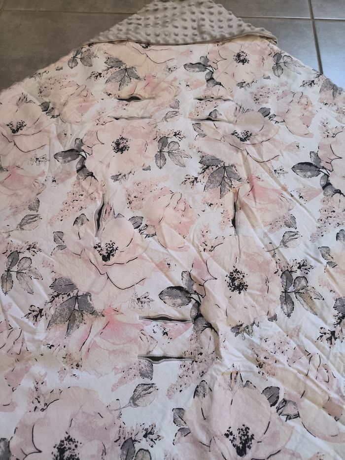 Couverture de poussette avec les espaces pour passer les sangles, très peu utilisée. Motif floral