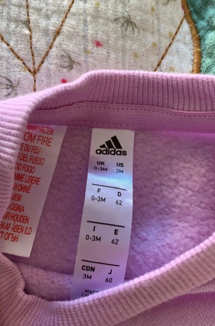 Ensemble adidas Taille 0/3 mois mais convient mieux à un 2/3 mois. Porter une fois. Parfait état.