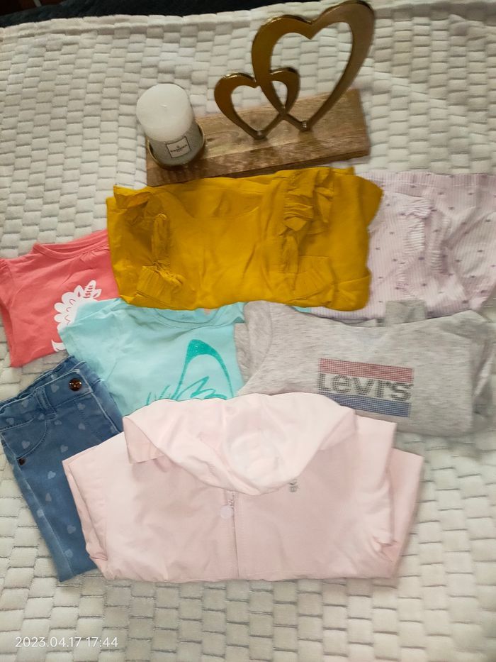 Lot de 7 articles en excellent état pratiquement neuf certains de grandes marques : **Combishort Disney baby Bambi pailleté **Pull fin à capuche Levi's (véritable) voir photo **Jeans orchestra motif coeur **Robe tunique Tex baby manches longues **Veste à capuche déperlant OBAÏBI valeur d'achat 45 € **Robe moutarde dos nu Kiabi