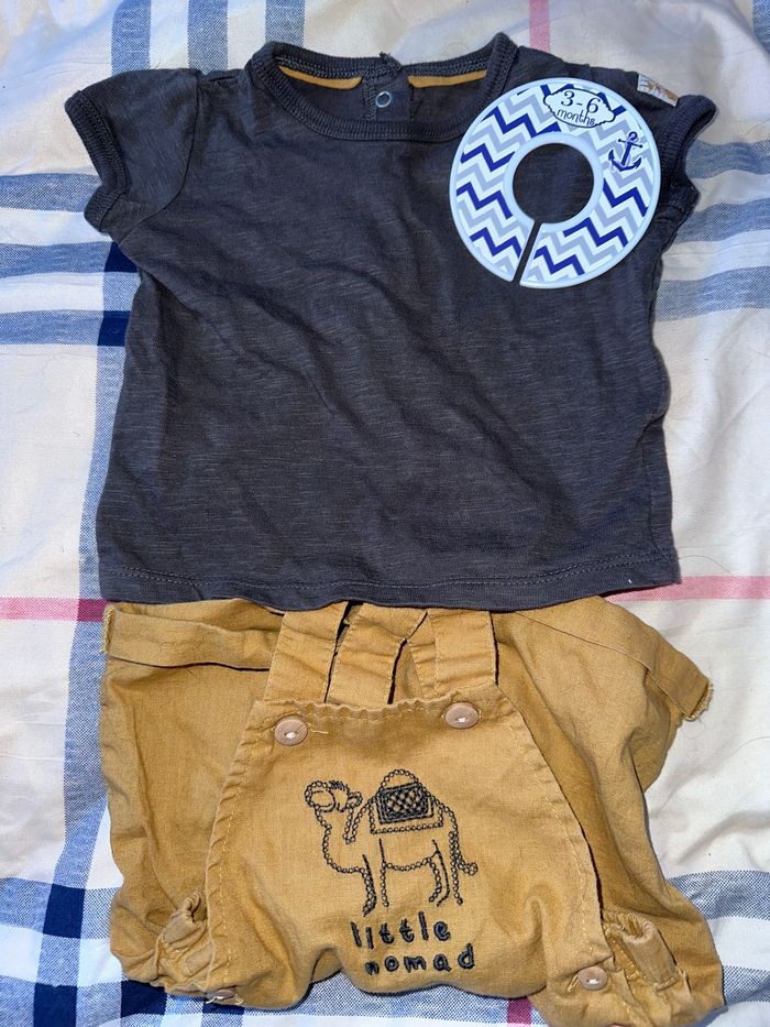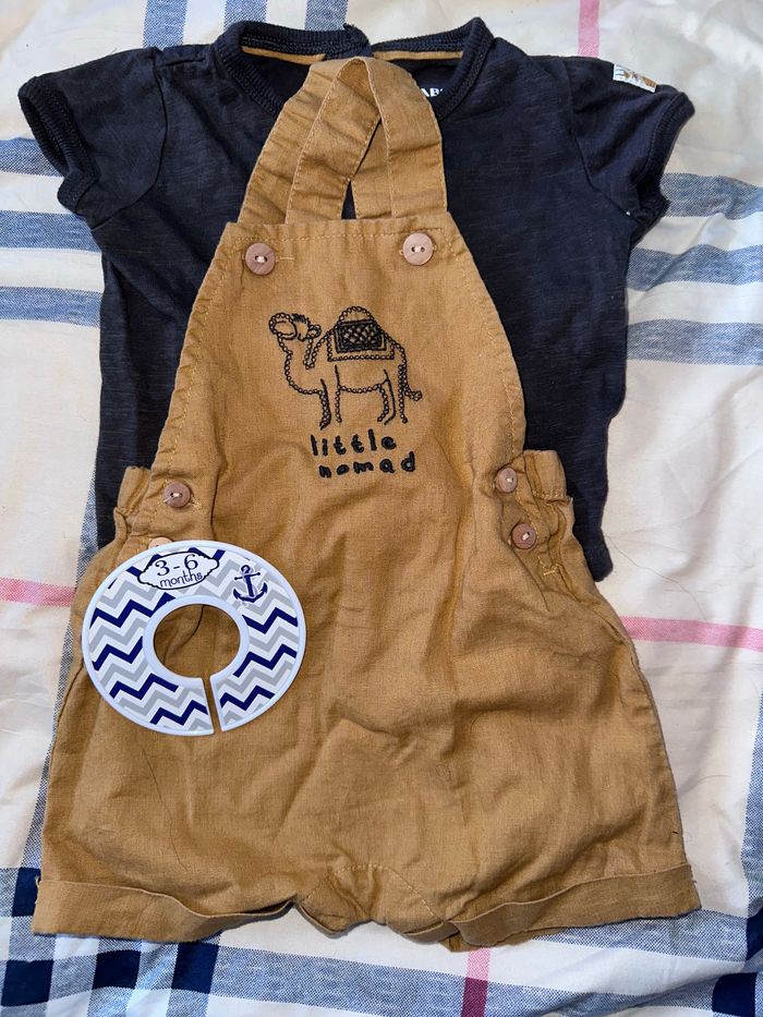 Ensemble 6 mois, comprend salopette couleur sable, et t-shirt porté qu'une fois, comme neuf #6moiskay57070 #ensemblekiabi #kiabi6mois #ensemble2pièces #chameau #salopette6mois #ete6mois