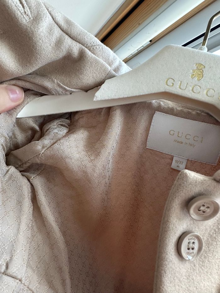 Comme neuf taille 9-12 mois Nettoyer en pressing Vendu avec son cintre gucci ( casser a un endroit voit photos ) Et vendu avec sac Gucci