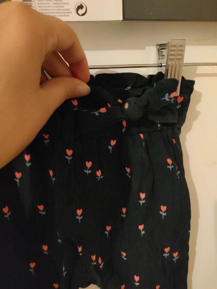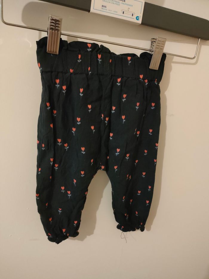 Pantalon fluide de chez Kiabi en 9 mois. Très bon état bleu marine avec des petites fleurs roses, élastique à la taille et cheville + un petit noeud sur le côté gauche. Il a était porté un peu Prix 2€