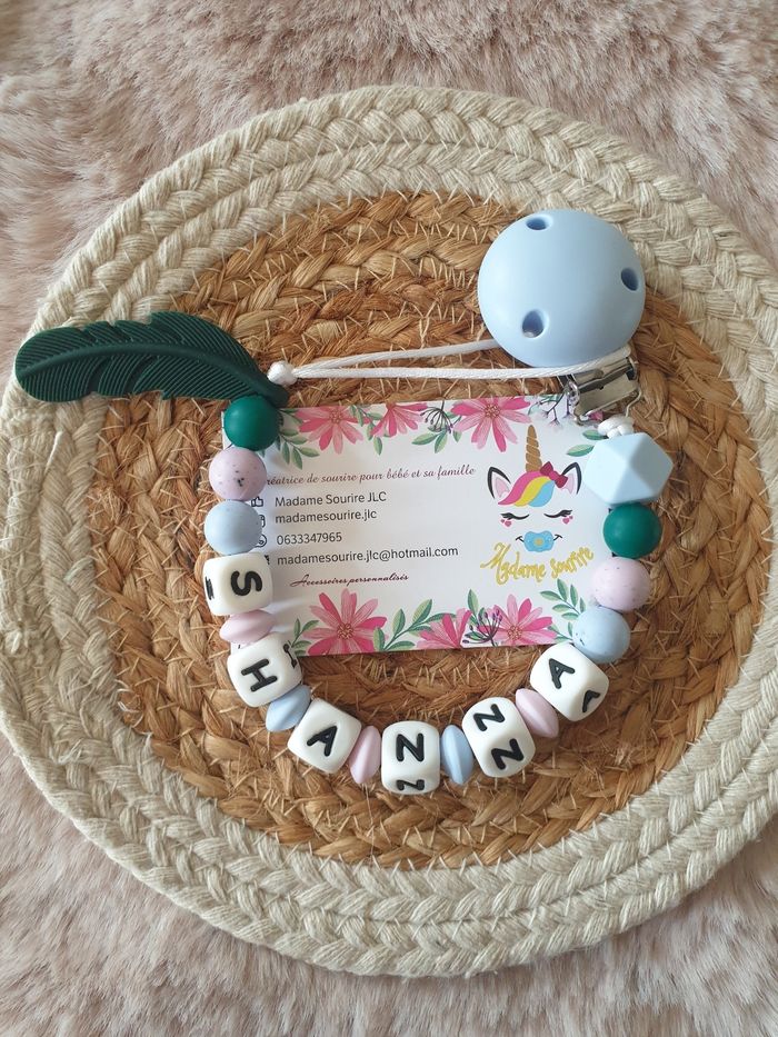 Attache tétine Plume 100% personnalisable en silicone alimentaire et/ou bois naturel. Large choix de perles, le style, les couleurs, nous personnalisons ensemble main dans la main pour créer votre accessoire idéal. Contactez-moi par message pour personnaliser ou tout renseignement.
