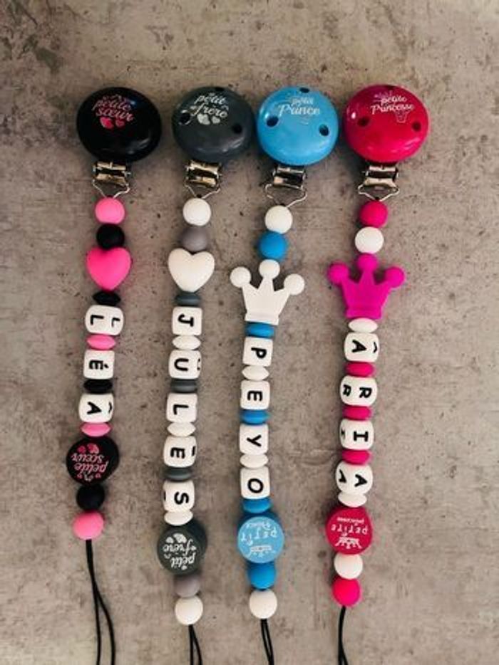 Attache tétine personnalisé en silicone ou en bois au souhait de l’acheteur . Personnalisable au choix de l’acheteur que ce soit la couleur comme le prénom ou le thème . Le fil est doublé pour plus de sécurité tout le long de l’attache tétine. N’hésitez pas à me demander et regarder mon dressing. Une photo vous sera envoyée avant l’expédition pour vous ayez un aperçu du rendu. Tous les produits sont réalisés avec du materiel spécial conçu aux bébés , enfants.