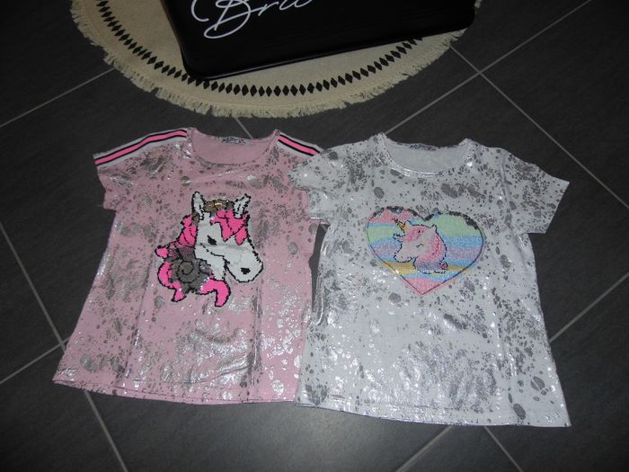 Bonjour 👋 Je vend ce : Lot de deux t-shirt fille 👧 10 ans " motif licorne 🦄 sequin réversible " 👉un rose 👉un blanc Maison 🏠 non fumeur et sans animaux