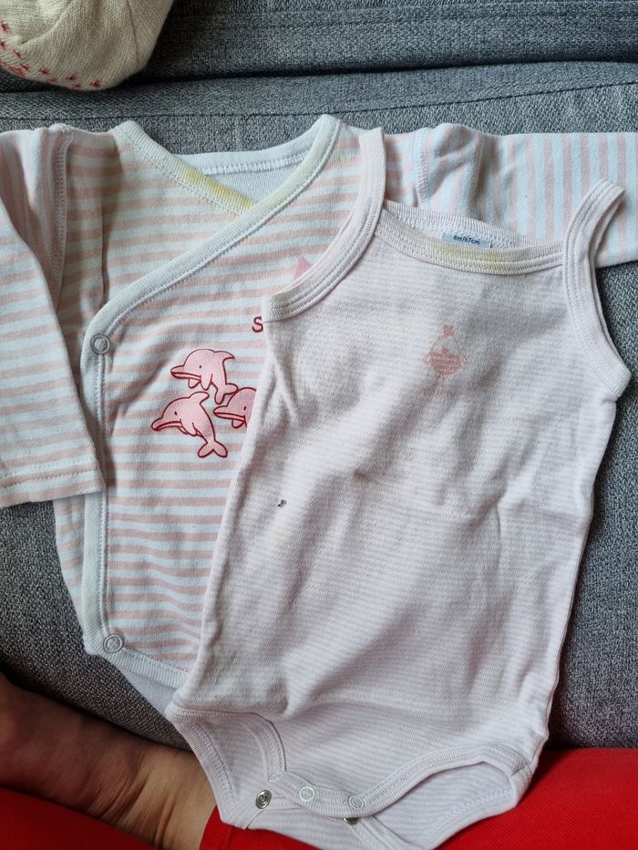 Lots de 2 bodies ils sont tout les 2 taché au niveau du col Je le met à petit prix car peuvent encore servir malgré les taches 1 manche longue et le 2eme à bretelle de la marque petit bateau