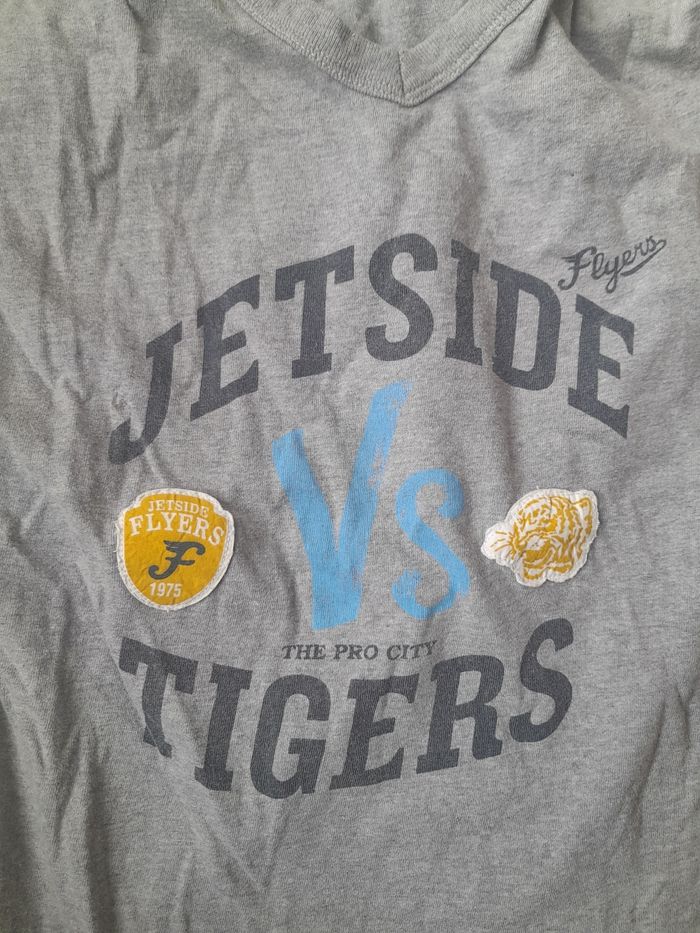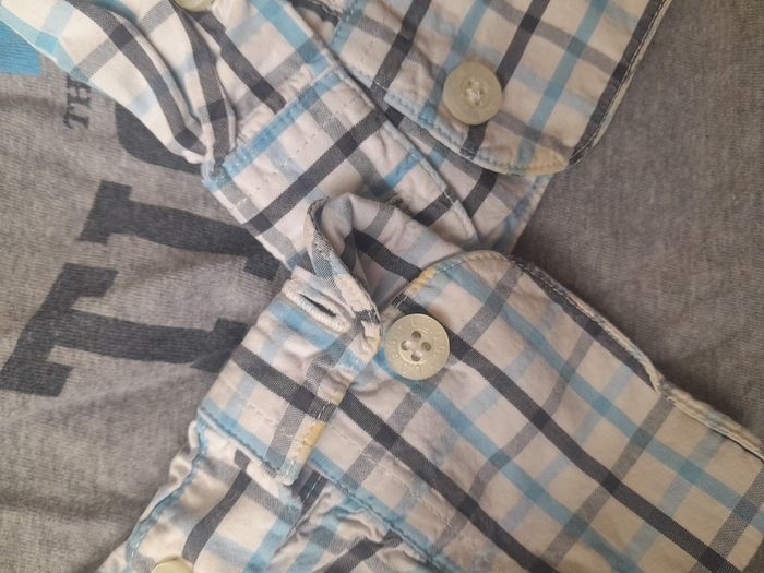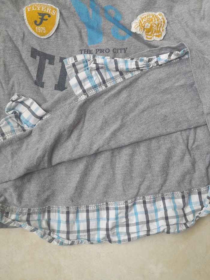 Tee-shirt manches longues en tissu avec manches et bas du Tee-shirt avec effet chemise. Couture des manches un peu jaunie. Pas de taille mais correspond à du 8 ans.