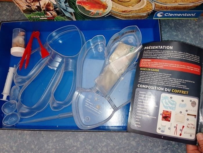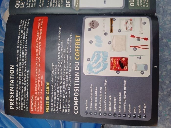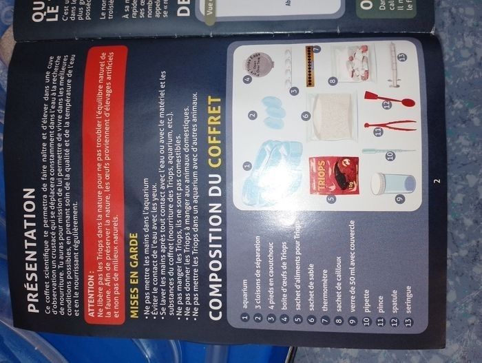 Triops les animaux préhistoriques Clementoni Sciences et jeu 8ans et + Le n°5, 1 sachet entamé d'aliments pour triops Manque le n°4 boîte d'oeufs de triops ( Le 4 et 5 peuvent se racheter en magasin ou sur inter ) Et le 7 thermomètre qui est manquant #Boîte de rechargement Dans les 5 à 10euro ce qui permettra d'avoir une boîte complète pour démarré Matériel de remplacement pour les boîtes d’expérimentation Triops. La boîte contient des œufs Triops, de la nourriture Triops et du sable pour élever ces fascinantes écrevisses préhistoriques qui ont survécu jusqu’à nos jours. Fais éclore les oeufs triops Nourris les et regarde les grandir dans ce grand aquarium Avec manuel scientifique illustré Dans les 5 à 10euro pour une boîte de rechargement des pièces manquante