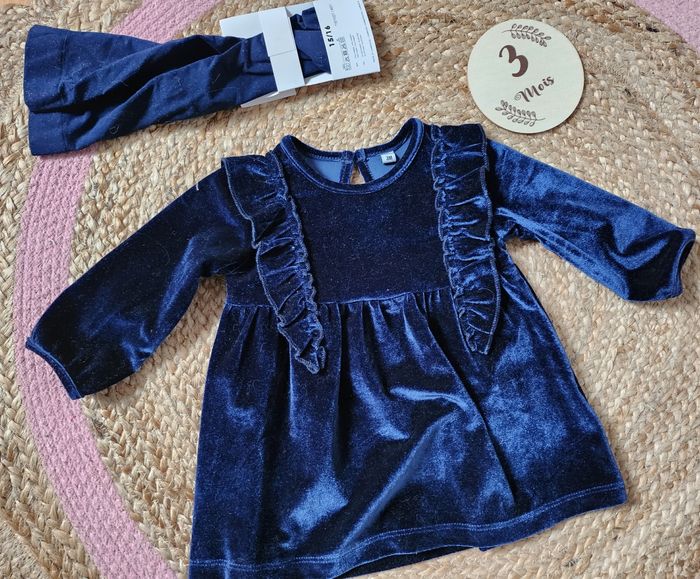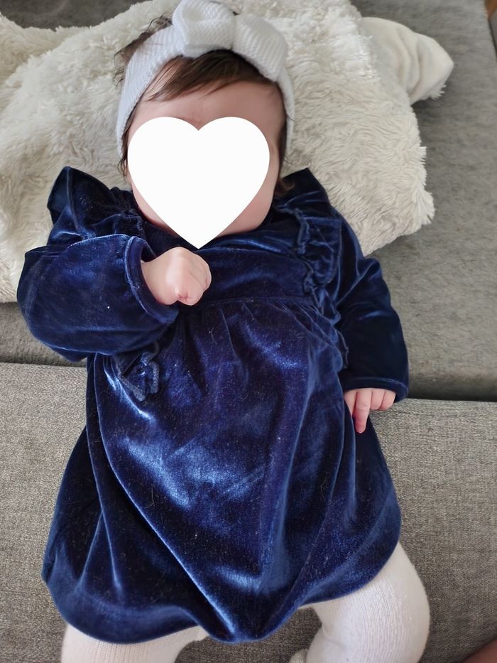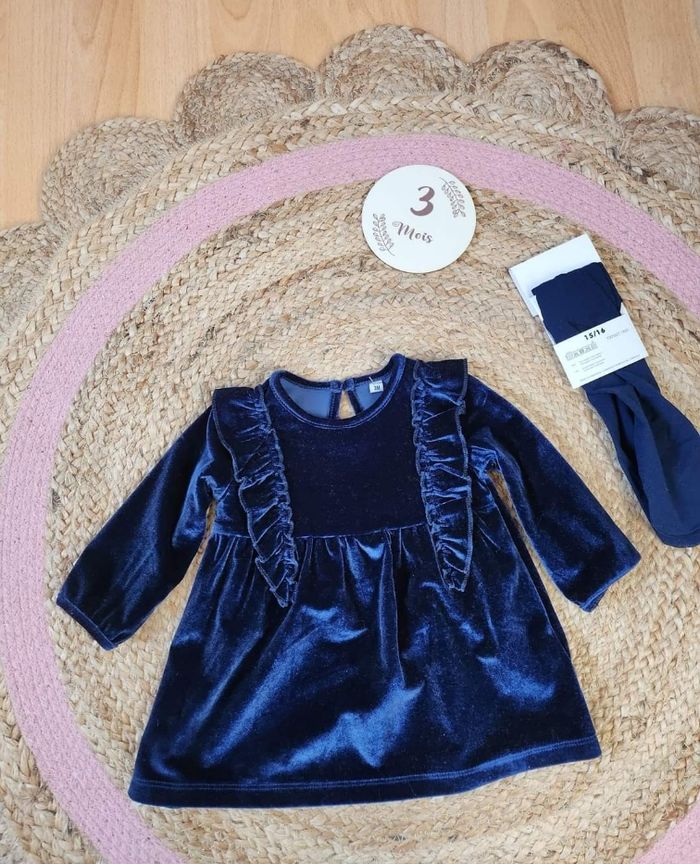 Belle robe velour bleu luisant + collants fins 15/16 3 mois Très bon état (portée 2 fois)