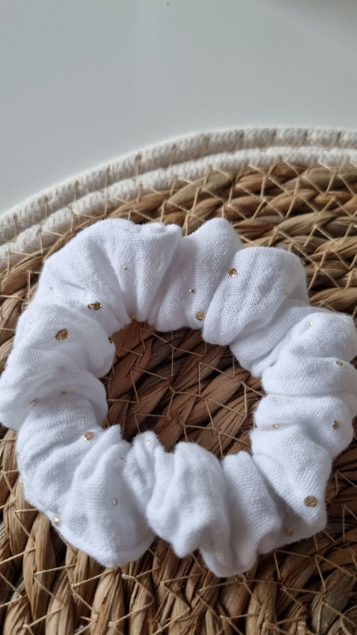 Chouchou enfant Tissu : Double gaz de coton + paillettes dorées Entretien : Si besoin, utilisez un chiffon humide (évitez le lavage en machine pour préserver les paillettes) N'hésitez pas à me contacter pour toutes demandes ou infos 😊