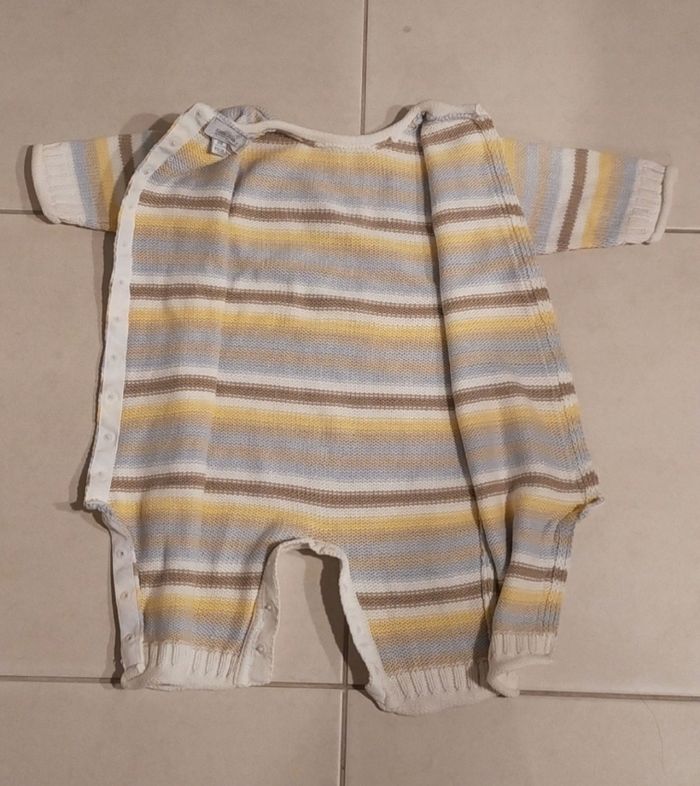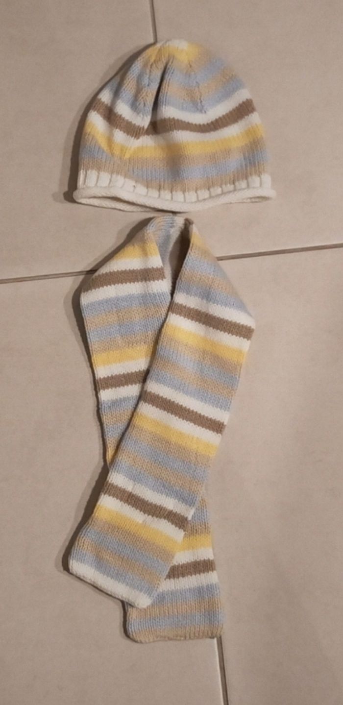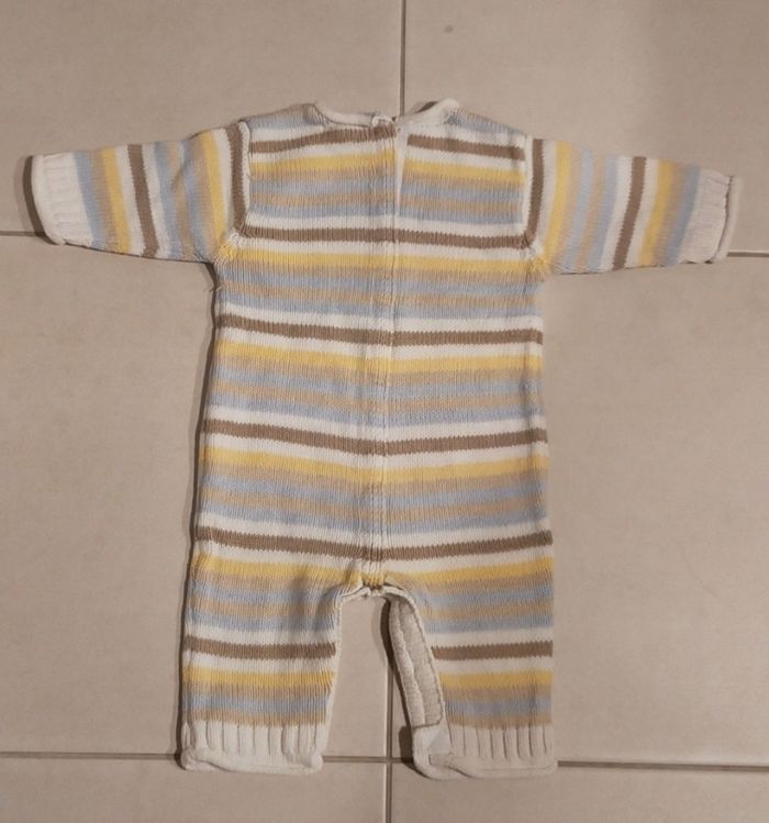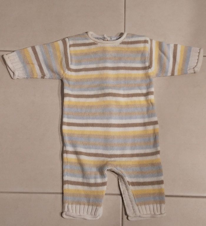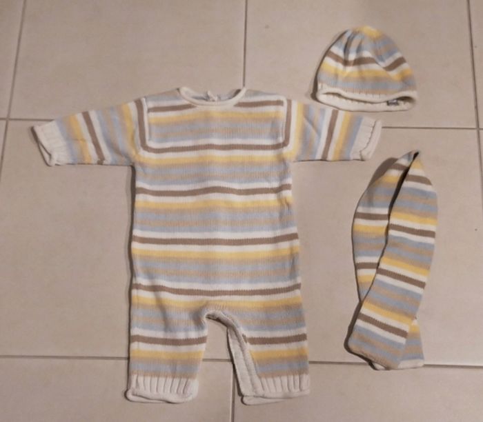 Ensemble 3 pièces composé d'une combinaison avec fermeture par pressions à l'arrière et à l'entrejambe, d'une écharpe et d'un bonnet Marque : Kiabi Taille : 3 mois L'ensemble est en excellent état, porté une seule fois