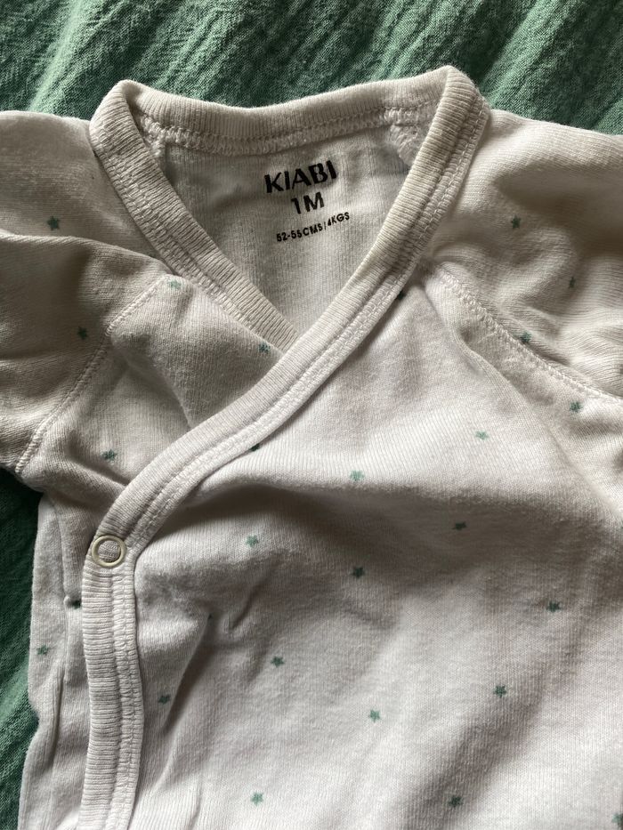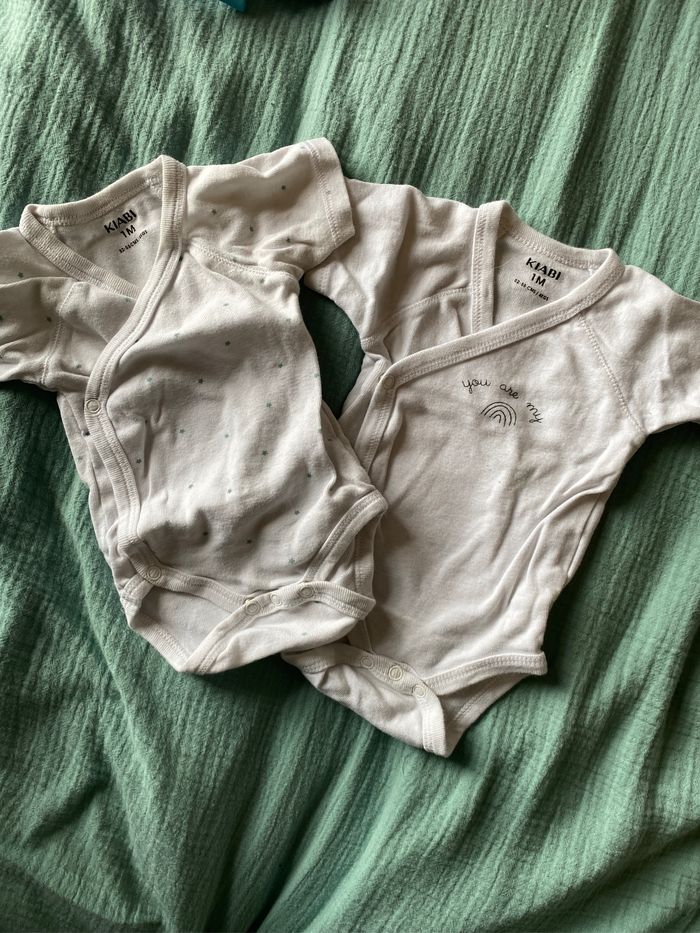 Lot de deux bodies manches courtes avec ouverture cache coeur Un avec une inscription l’autre moucheté de petites étoiles vert d’eau Comme neuf