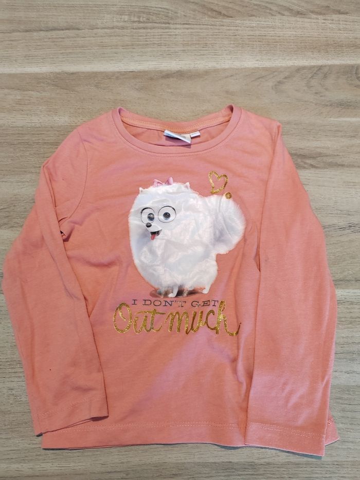 T shirt manches longues 4-5ans couleur orange avec motif chien. Très bon état.